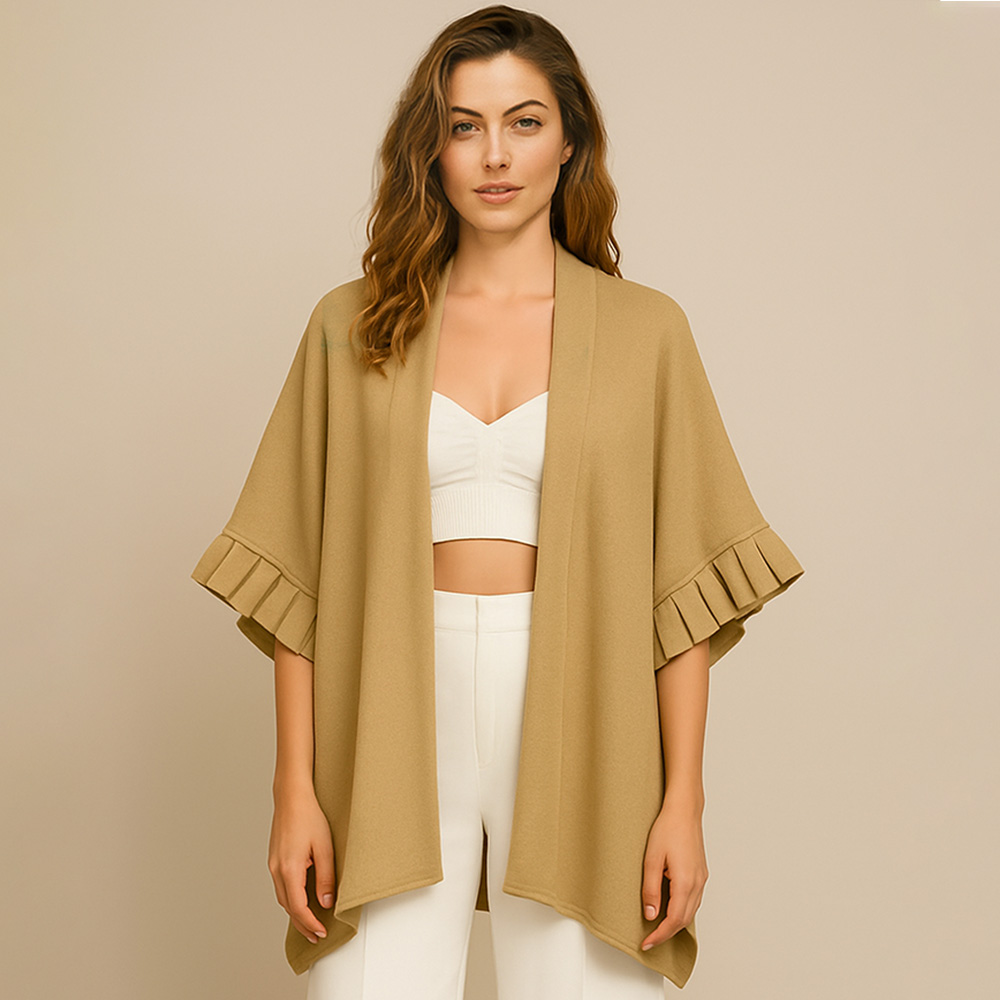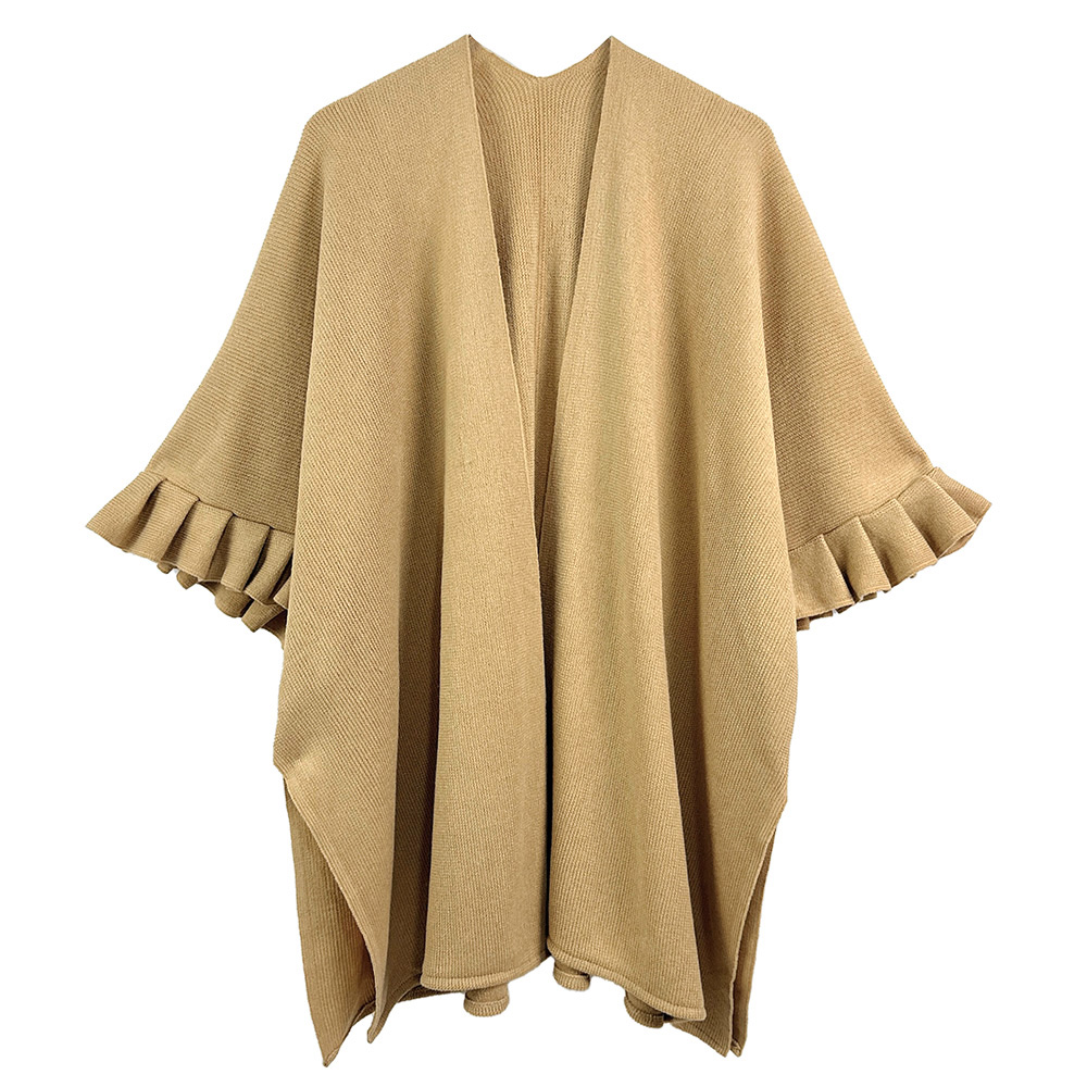 • Enhance your style with this open front cape featuring elegant ruffled sleeve details for a modern touch. Its relaxed fit and flowing silhouette make it a versatile layering piece, perfect for casual or dressy looks, offering comfort and sophistication for any occasion or season.