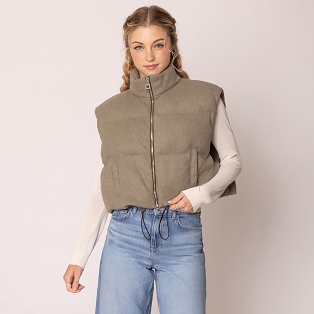 • Elevate your layered looks with this sleeveless puffer vest featuring a high neck, zip closure, and drawstring hem. Designed with front pockets for convenience, it offers both warmth and style, making it a versatile outerwear piece for casual outings and transitional seasons.