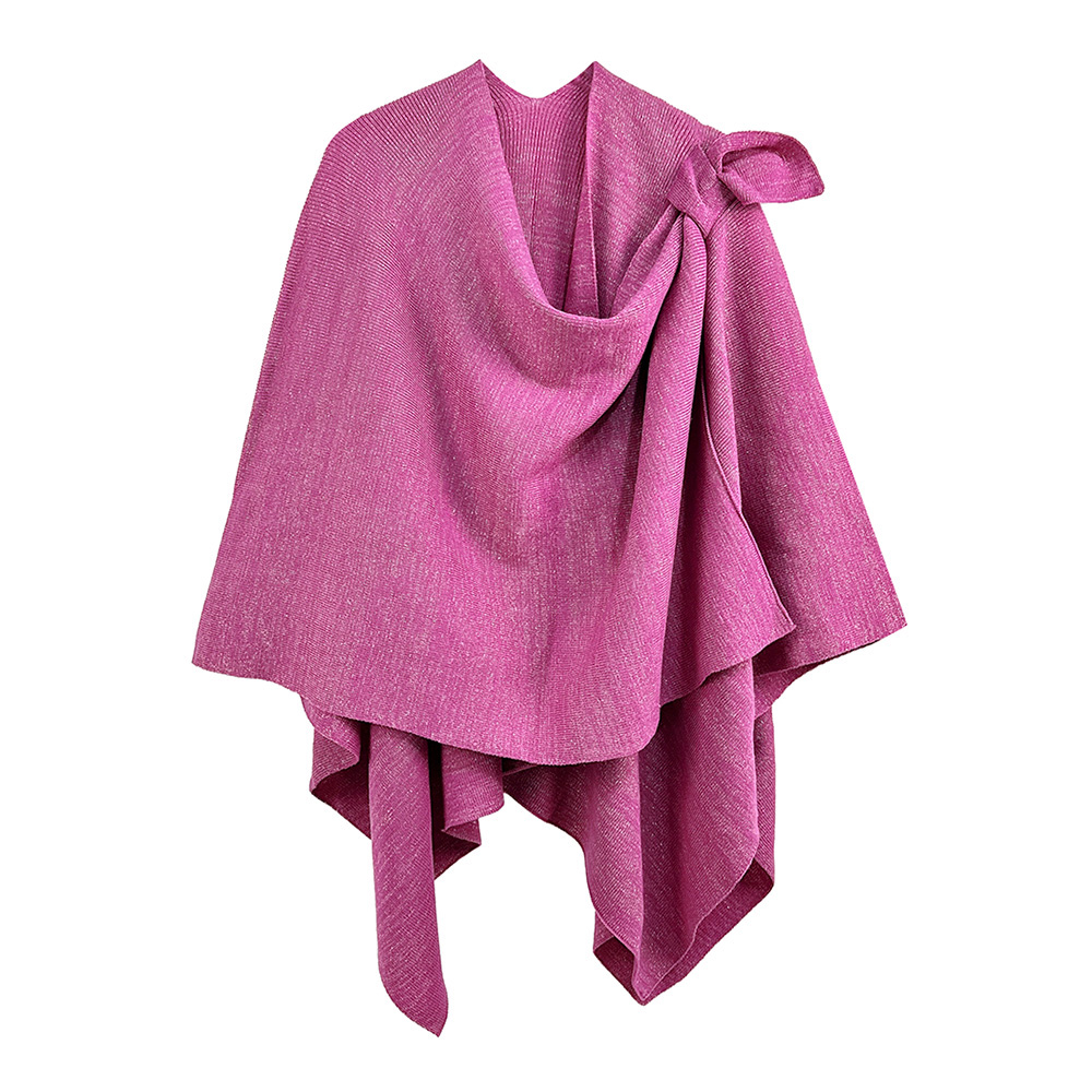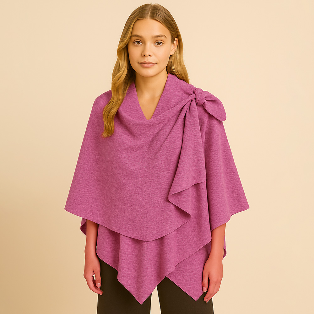 • This elegant drape poncho features a flowing silhouette with an asymmetrical hem and a chic side bow detail for added sophistication. Perfect for layering, it offers timeless style and effortless comfort, making it an ideal choice for both casual wear and refined evening outings.