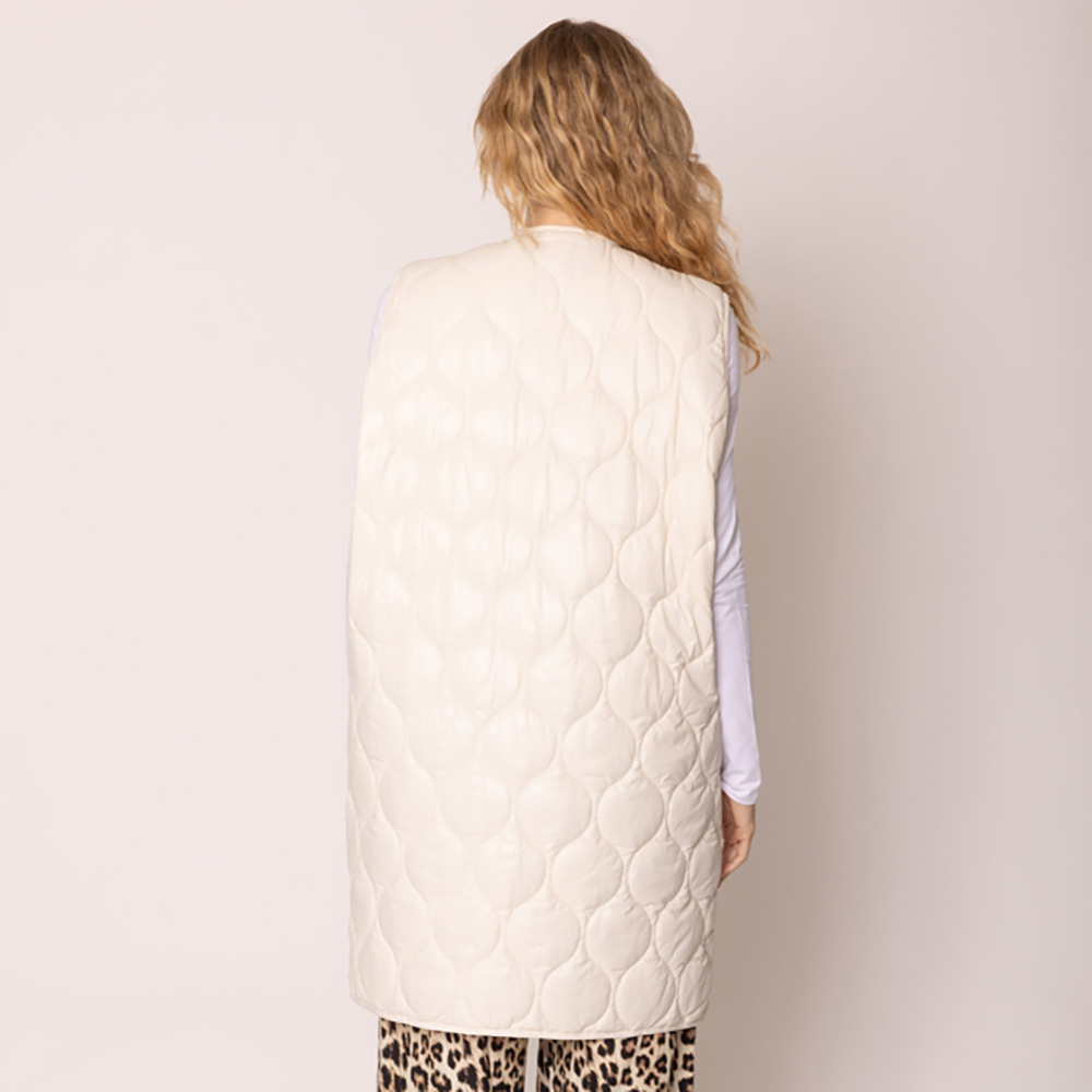 • Layer up in style with this quilted longline vest. Designed with a sleek silhouette, front pockets, and lightweight padding, it’s the perfect piece for transitional weather. The sleeveless design makes it easy to layer over sweaters or tops, while the quilted texture adds a touch of modern chic. Comfortable, versatile, and effortlessly stylish—ideal for everyday wear, travel, or casual outings.