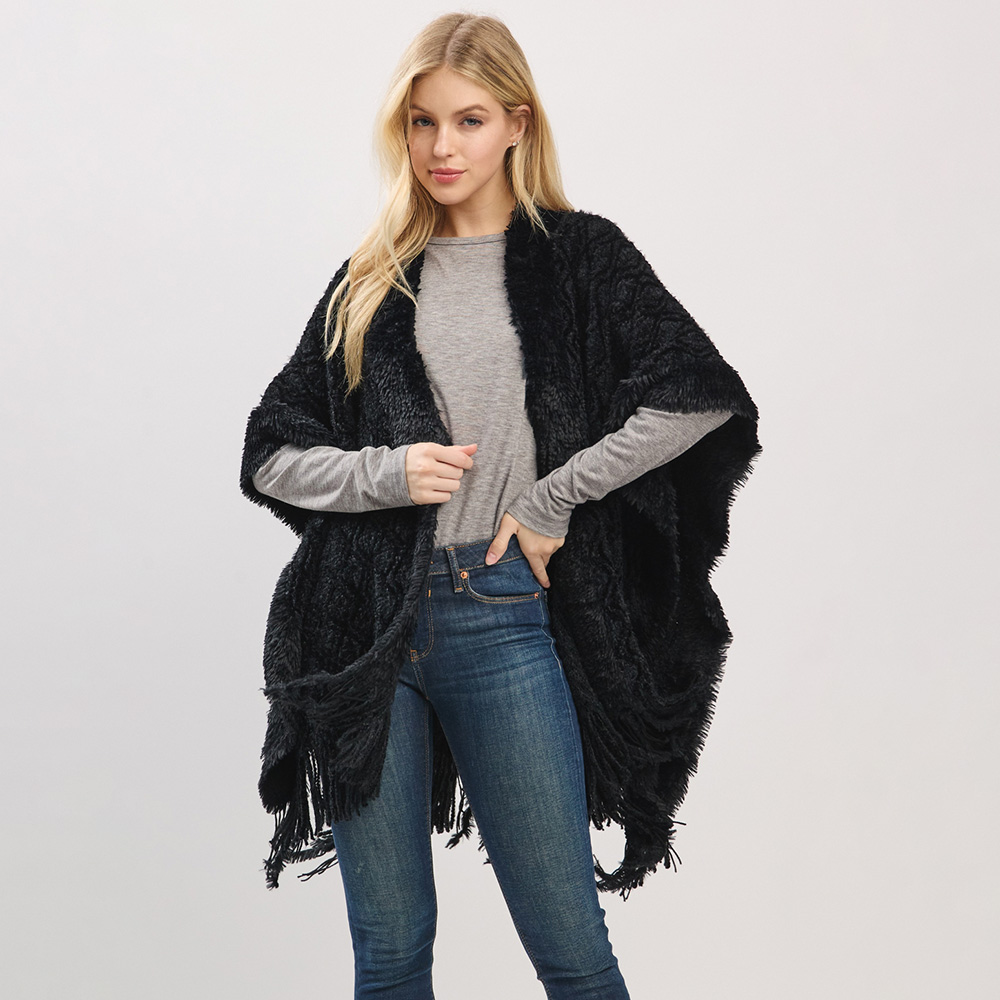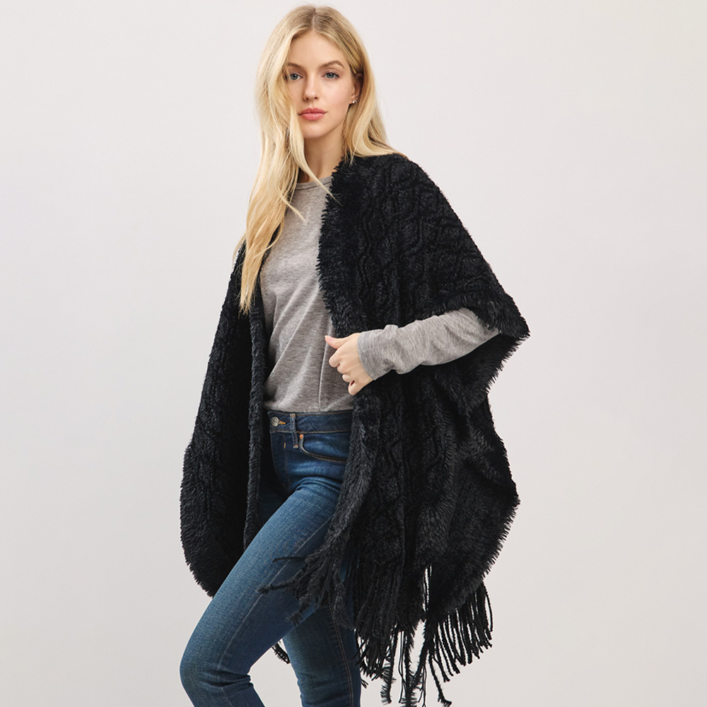 • A cozy poncho wrap designed with soft textured fabric and finished with fringe trim. Effortless to layer over casual or dressy looks, this versatile style provides warmth and comfort while adding a chic touch to everyday outfits.