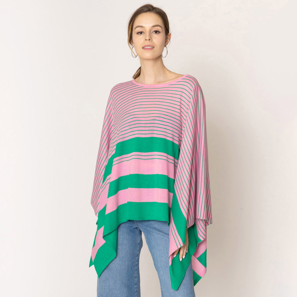Details • Size : 51.2" X 25.6" • Material : 100% Acrylic • This loose fit knit top features a mix of vertical and horizontal stripes with wide sleeves for a modern silhouette. Its relaxed drape and bold pattern make it a versatile choice for layering or wearing alone in both casual and chic outfits.