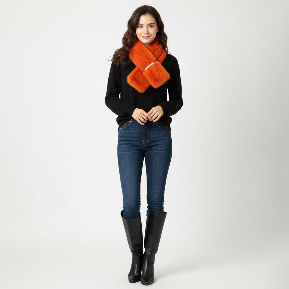 • Chic faux fur scarf with a cozy slip-through design, offering softness, warmth, and elegance for cold weather styling. A versatile accessory that pairs effortlessly with casual or dressy outfits, adding luxury to any winter look.
