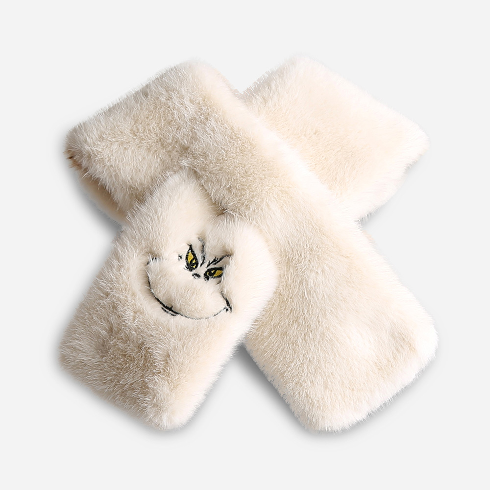Details • Size : 4" X 34" • Grinch Embroidered Faux Fur Scarf – A cozy winter scarf with a playful embroidered design. Soft, stylish, and full of festive charm, perfect for adding a fun twist to any outfit or as a cheerful holiday gift for the season.