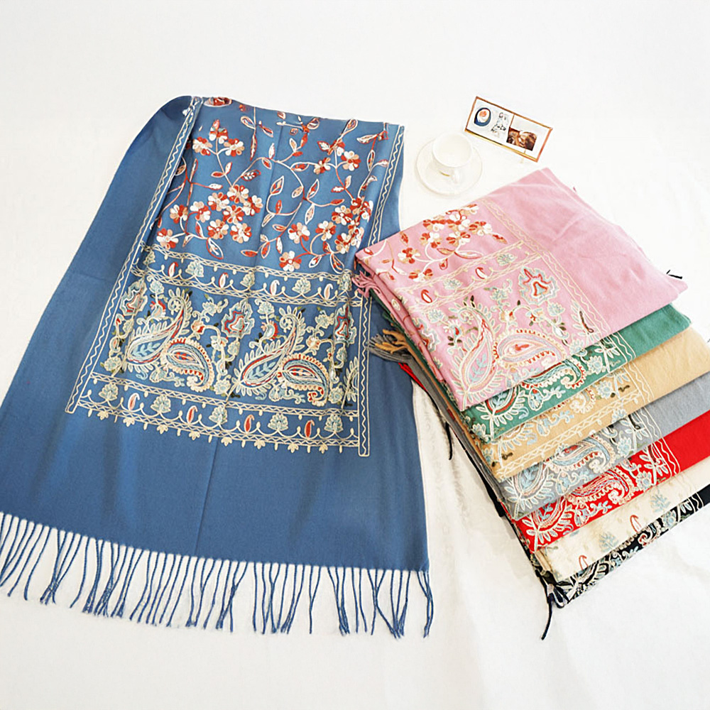 • Soft cashmere feel scarf with delicate floral embroidery and tassel trim. Lightweight yet warm, perfect for chilly stylish days.