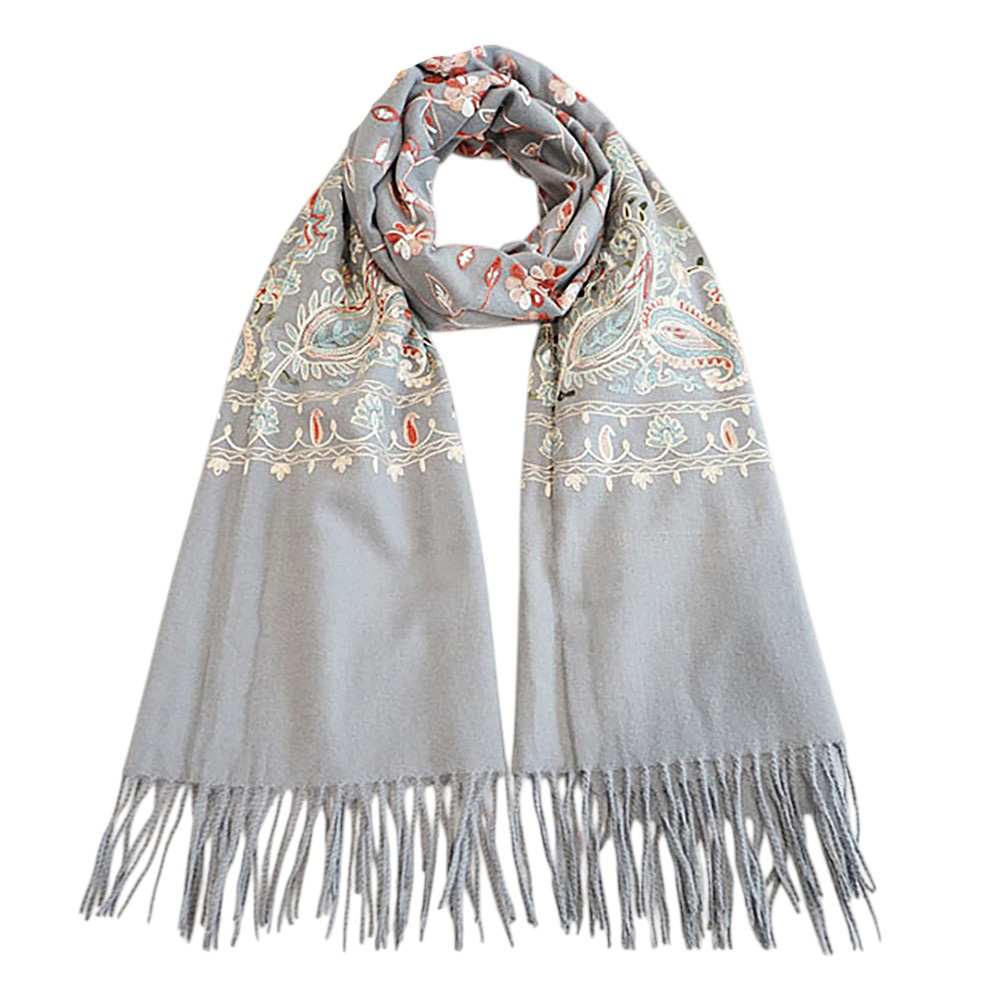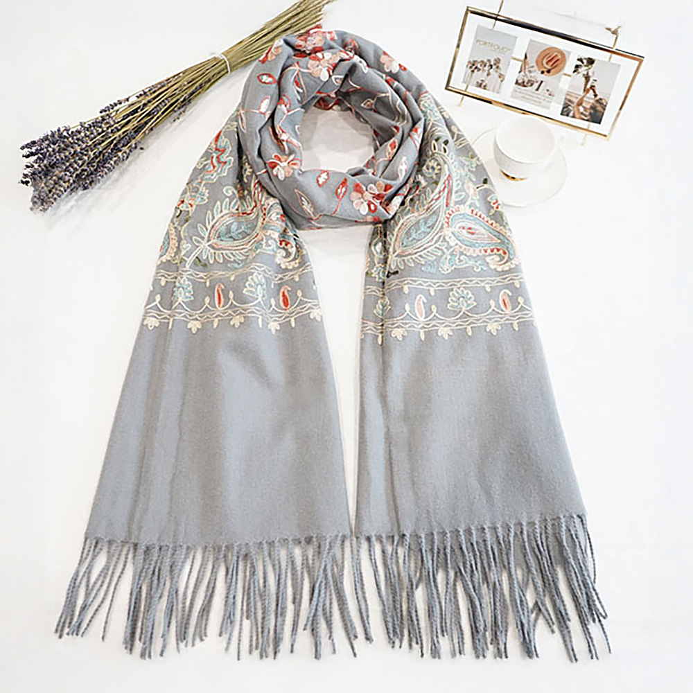 • Soft cashmere feel scarf with delicate floral embroidery and tassel trim. Lightweight yet warm, perfect for chilly stylish days.