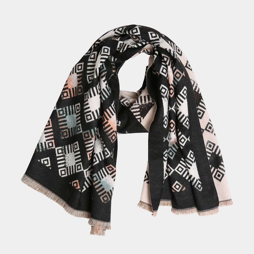 • A soft scarf featuring a bold geometric pattern with fringe edges. Lightweight and cozy, this versatile accessory adds warmth and a modern statement touch to everyday and seasonal looks.