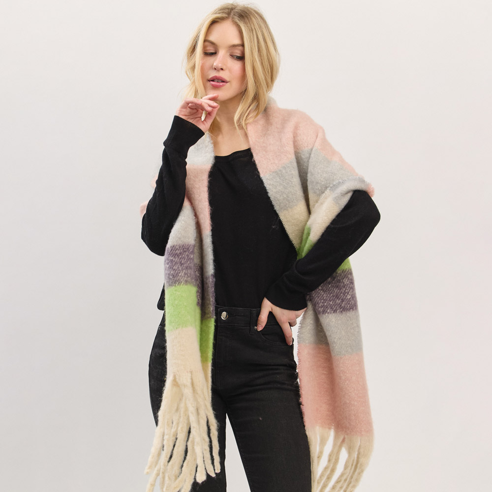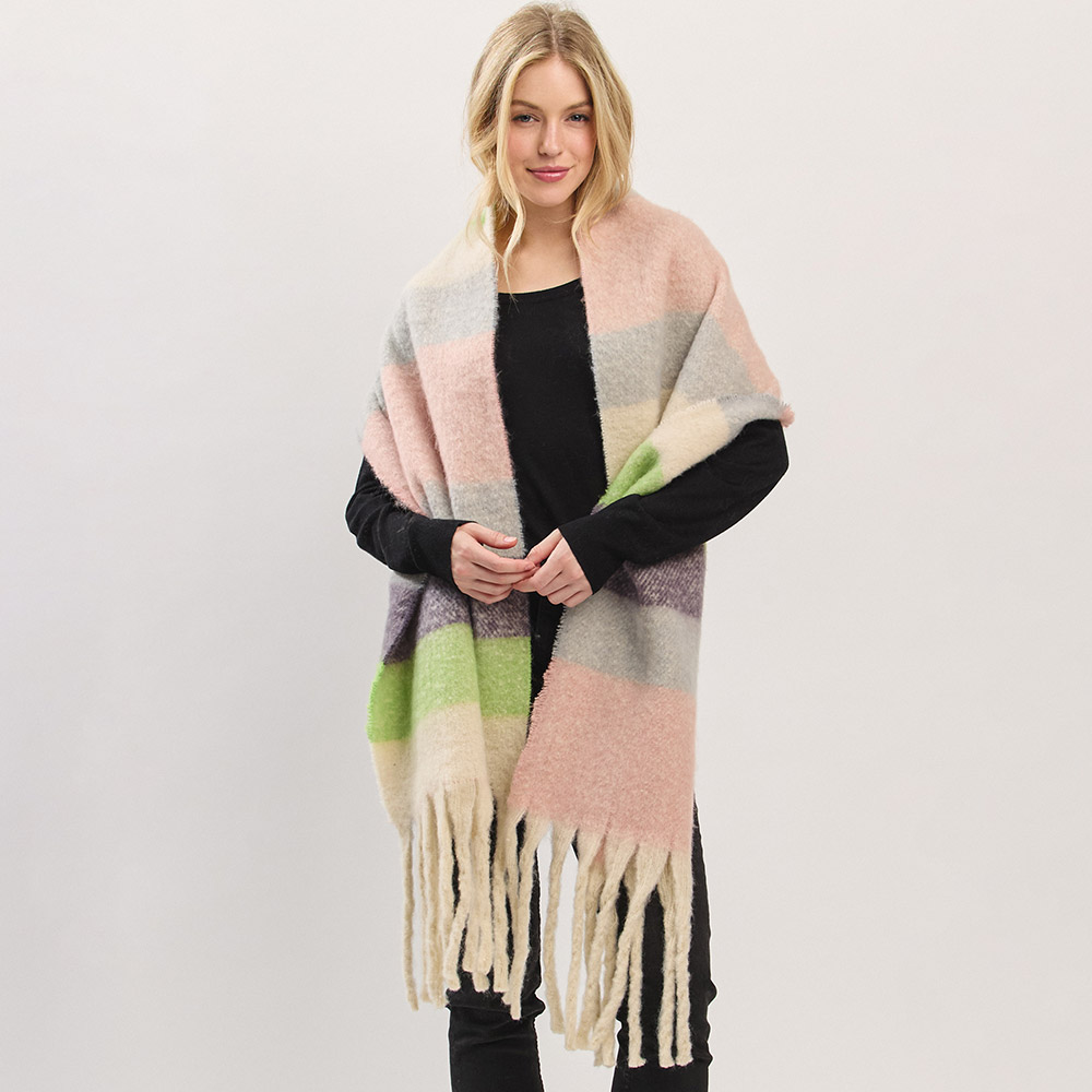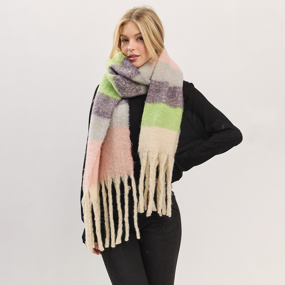 Details • Size : 71" X 16" • Material : 100% Polyester • Add a splash of playful style to your cold-weather wardrobe with this striped oversized knit scarf. Featuring a plush, brushed texture and generous length, it offers both warmth and vibrant appeal. Perfect for layering over any outfit for a cozy yet eye-catching statement.