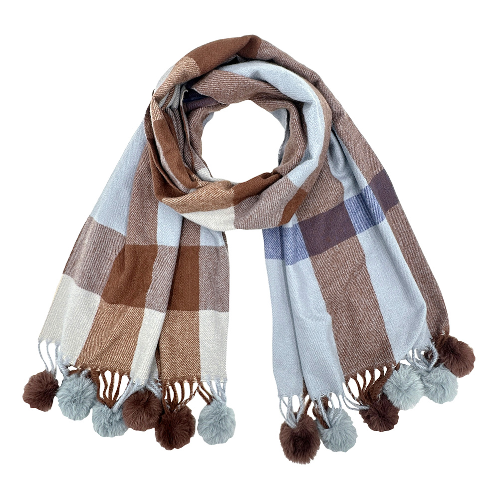 • Elegant checkered scarf with soft texture and playful pom-pom tassels. A versatile wrap that blends warmth and chic style, perfect for layering with casual or dressy looks, making it a must-have accessory for any season.
