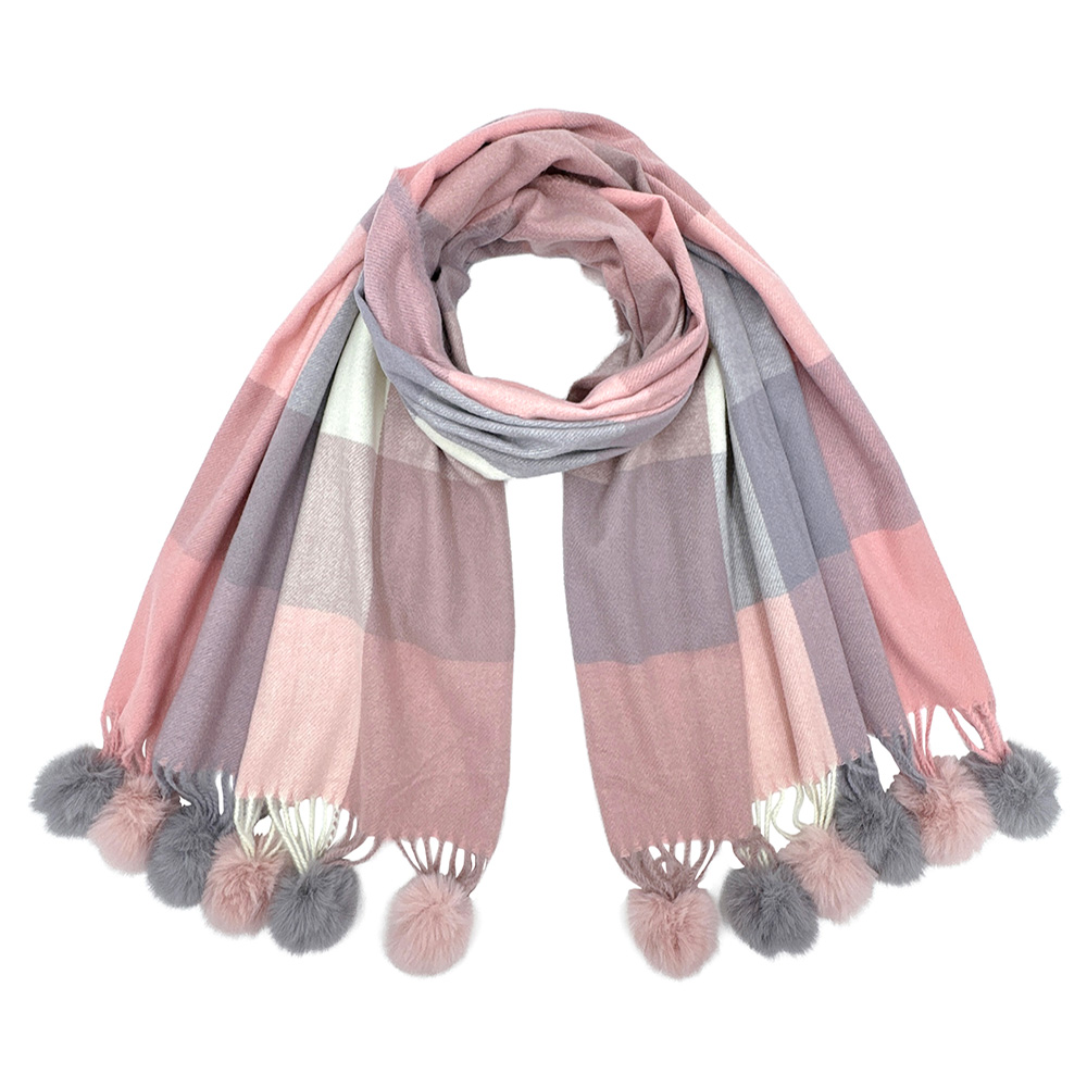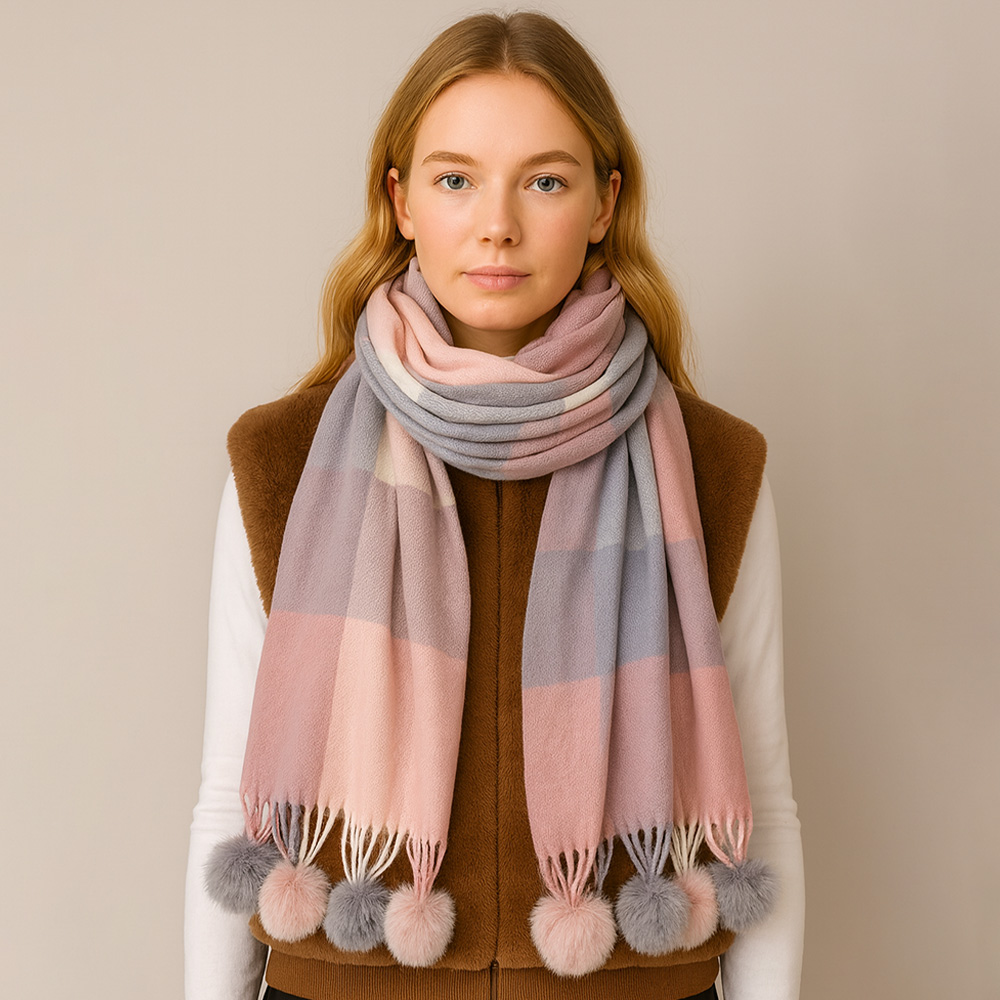 • Elegant checkered scarf with soft texture and playful pom-pom tassels. A versatile wrap that blends warmth and chic style, perfect for layering with casual or dressy looks, making it a must-have accessory for any season.