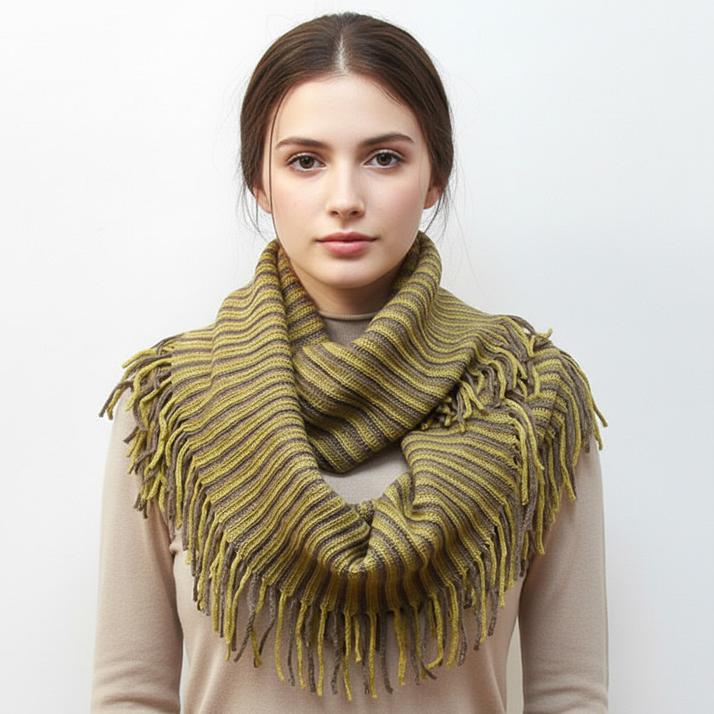 • Add a touch of texture and warmth with this striped knit infinity scarf featuring playful fringe edges. Its soft, looped design makes it perfect for cozy layering, effortlessly enhancing your seasonal wardrobe with casual elegance and everyday comfort.