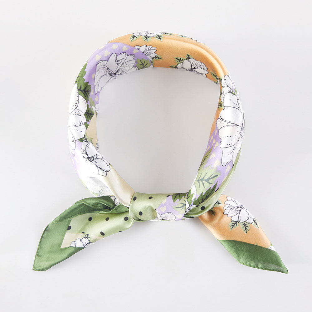 • This square scarf showcases a charming patchwork of floral motifs and playful dotted accents, offering a soft, artistic look. Lightweight and versatile, it adds a refined touch to everyday outfits, perfect for styling around the neck, hair, or as an accessory on bags.