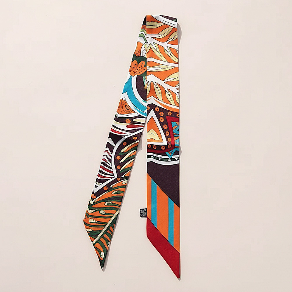 • Brighten your style with this geometric print skinny silk scarf, accented with striped and abstract details. Perfect for tying around the neck, hair, wrist, or handbags, this versatile accessory adds a pop of color and sophistication to any outfit.