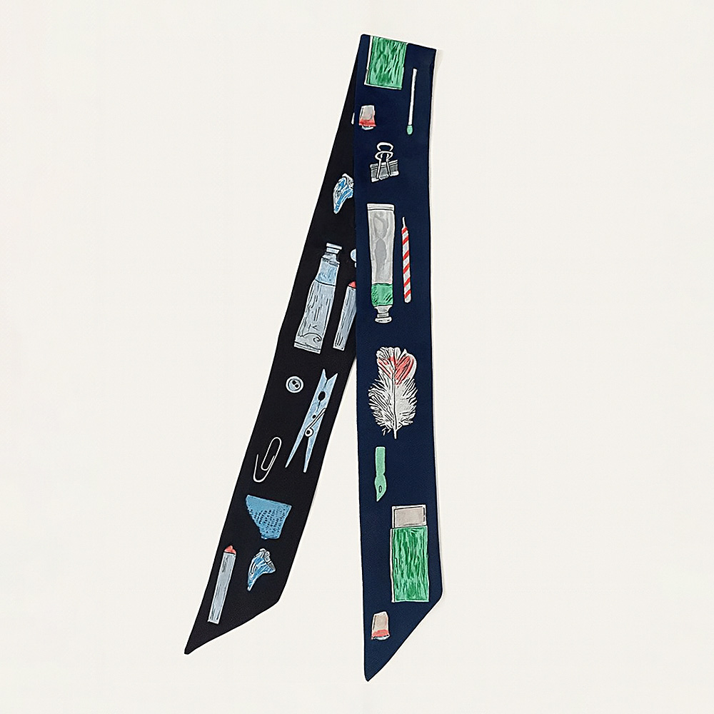 • Unleash your artistic side with this skinny silk scarf featuring a unique art-inspired print. Perfect for styling as a neck scarf, hair accessory, or bag charm, this versatile piece blends creativity with elegance for a chic modern look.
