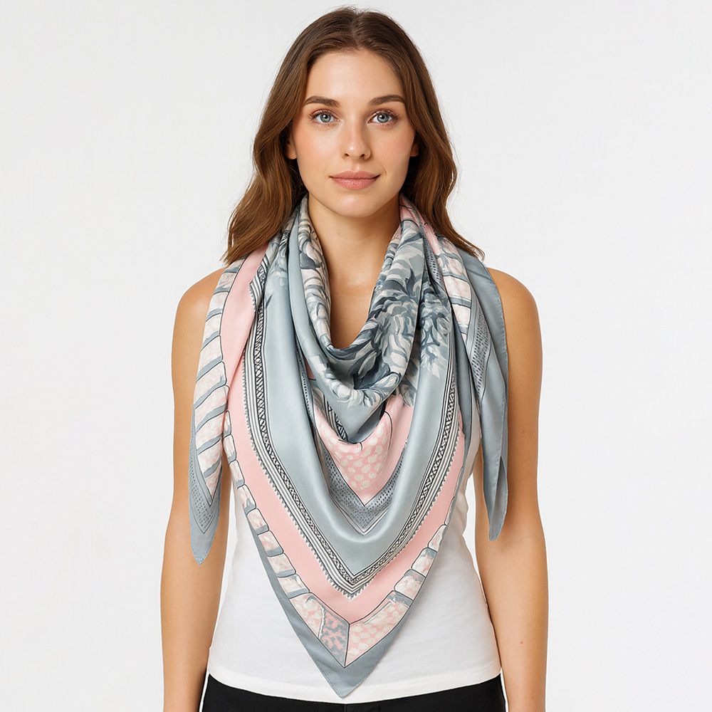 • Luxurious silky square scarf with intricate baroque-inspired design, perfect for chic everyday wear or elevated special occasion outfits.