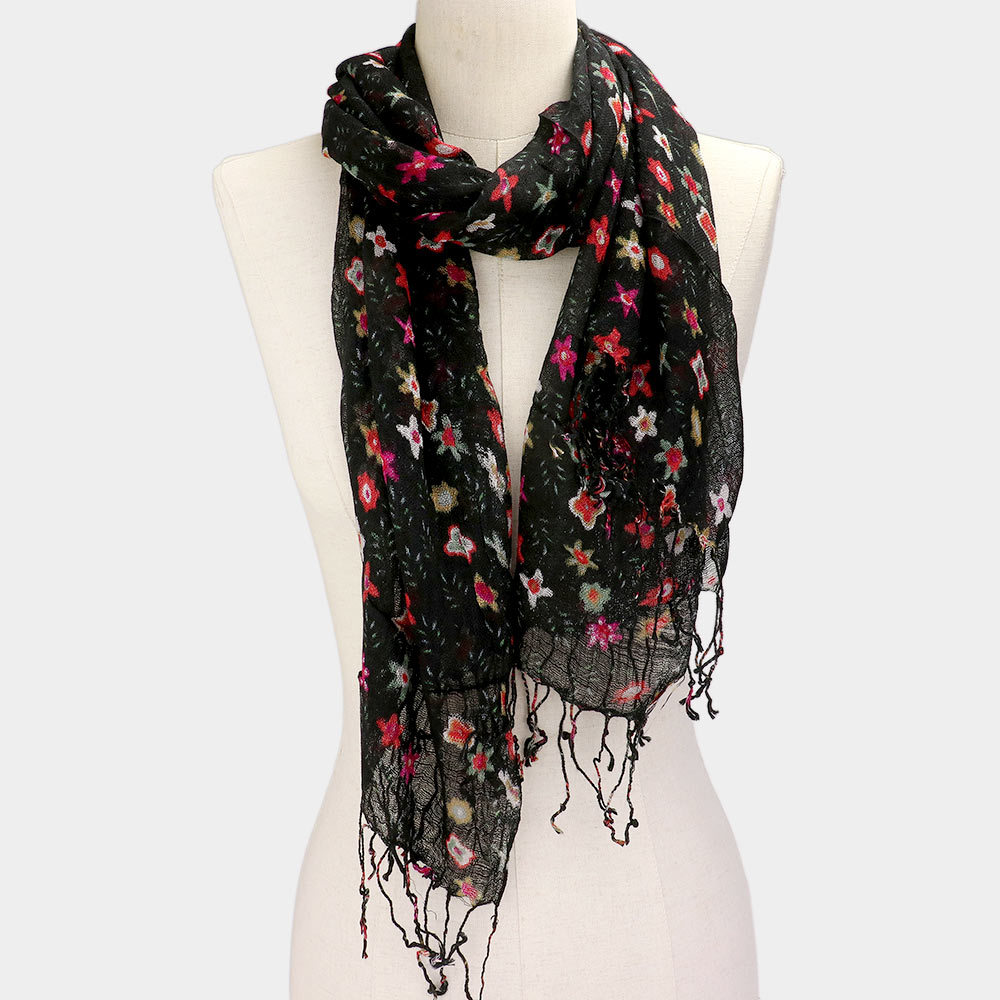 Open Front Baroque Floral Border Print Shawl Wrap Poncho with Loop