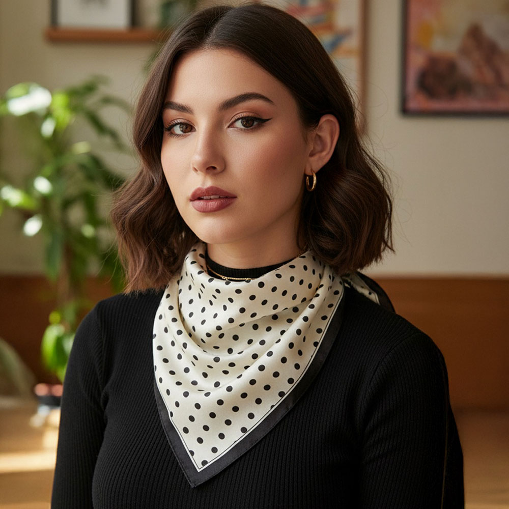 • Classic polka dot square scarf designed for versatile styling around the neck, hair, handbag, or wrist. A timeless accessory that adds a chic, retro-inspired touch to everyday outfits, seasonal looks, and boutique fashion collections while remaining easy to mix and match.