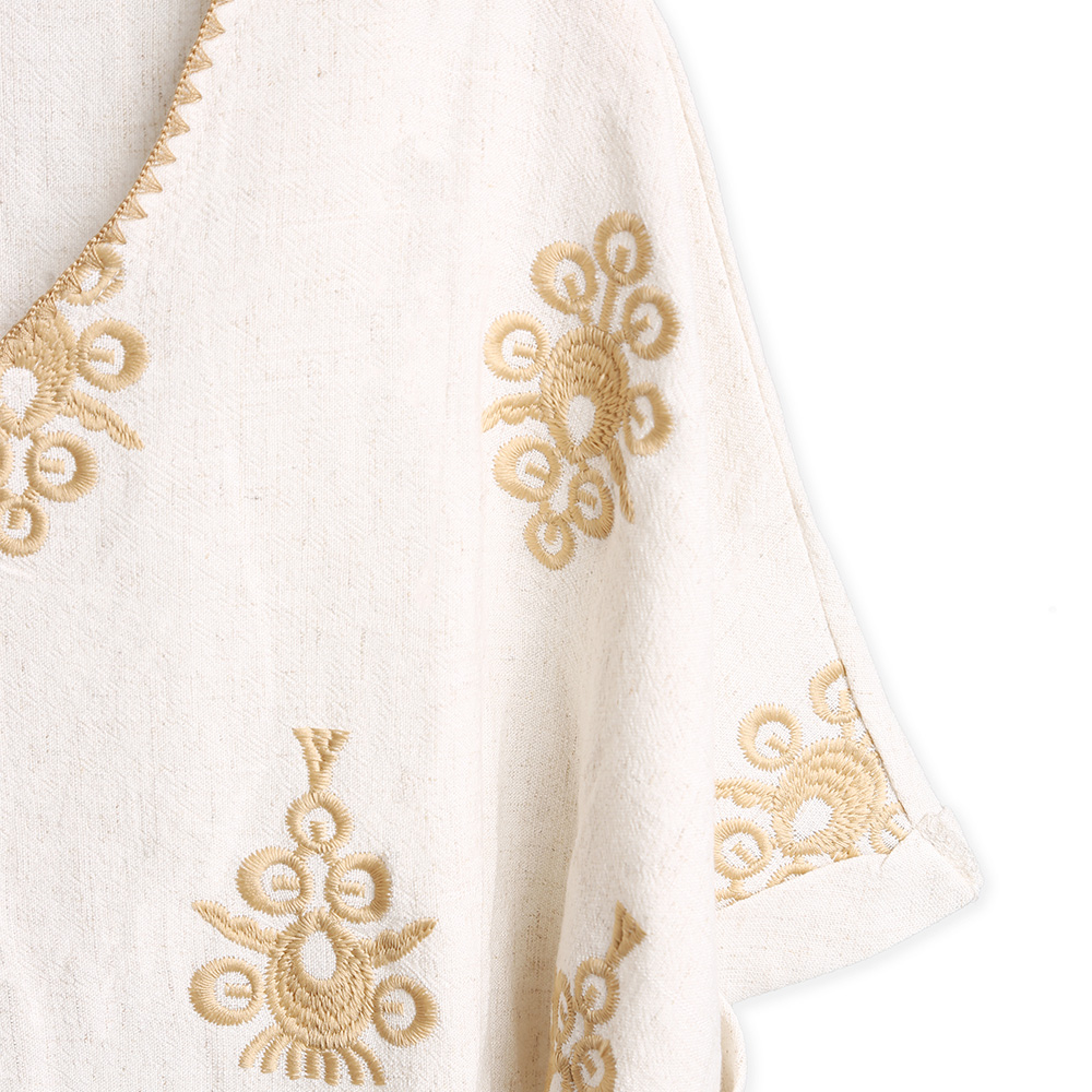 • Elegant beige embroidered linen-cotton blend blouse with short sleeves and intricate golden patterns. A breathable, stylish top perfect for spring and summer casual or boho-chic looks.