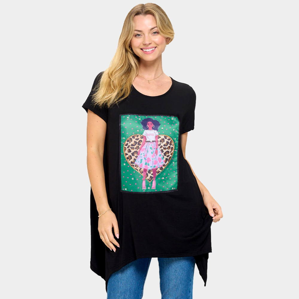 Stone Studded Leopard Heart Woman Printed Half Sleeve Top