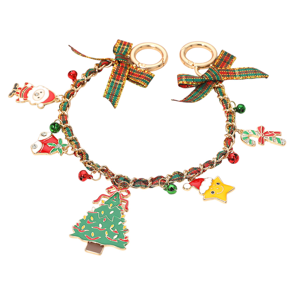 Details • Size : 12.5" L • Decor Size : 2.1" L • Bring holiday cheer to your bag with this Christmas charm accessory featuring playful pendants like a tree, Santa, stocking, candy cane, and star. Accented with jingling bells and festive ribbon bows, this seasonal bag charm is perfect for decorating totes, purses, or backpacks.