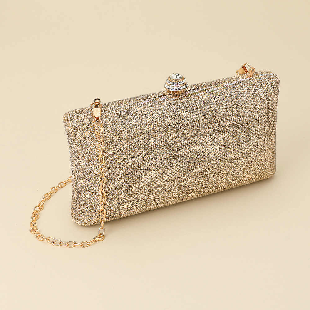 Details • Size : 7.25" X 4.25" X 2.25" • Strap Size : 46" L / Detachable • Clasp Closure • Chic evening clutch designed with a sparkling rhinestone clasp and detachable chain strap for versatile wear. Perfect for weddings, galas, or special events, this stylish handbag offers refined elegance while keeping your essentials secure in a sleek, timeless silhouette.