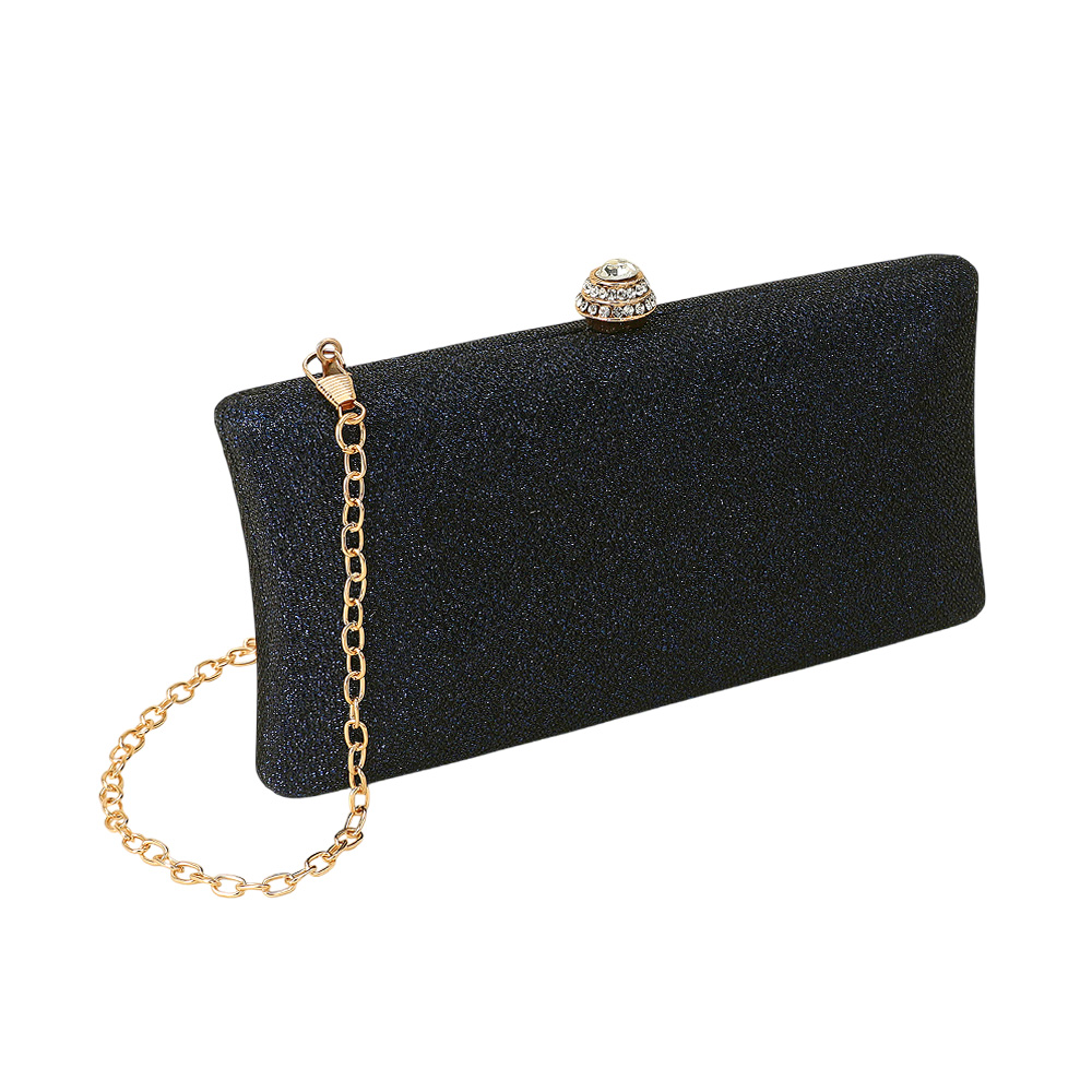 Details • Size : 7.25" X 4.25" X 2.25" • Strap Size : 46" L / Detachable • Clasp Closure • Chic evening clutch designed with a sparkling rhinestone clasp and detachable chain strap for versatile wear. Perfect for weddings, galas, or special events, this stylish handbag offers refined elegance while keeping your essentials secure in a sleek, timeless silhouette.