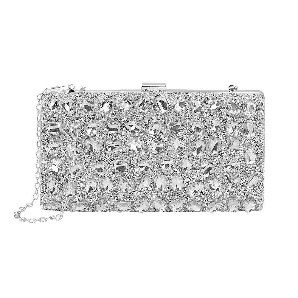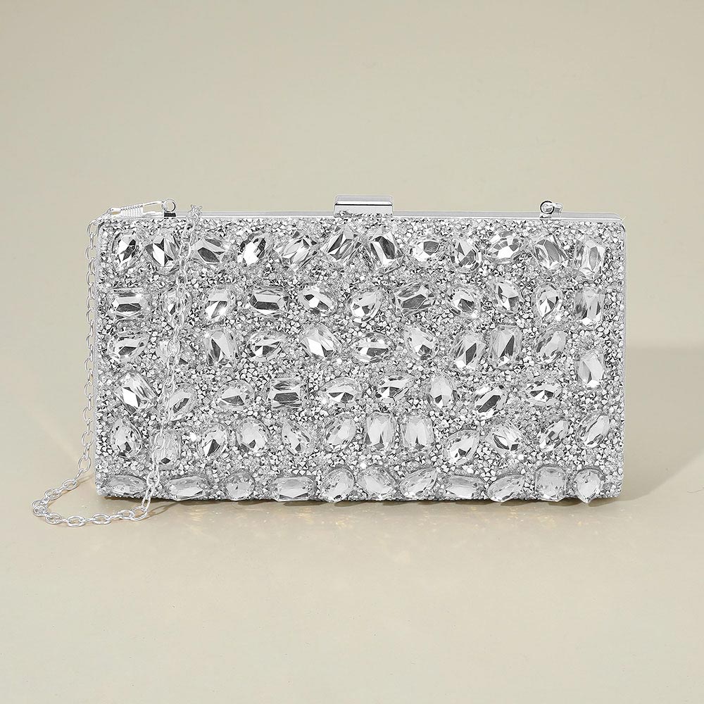 Details • Size : 8.6" X 4.6" X 1.6" • Strap Size : 47" L / Detachable • Clasp Closure • Glamorous evening clutch adorned with sparkling stone accents for a statement look. Designed with a sleek silhouette and chain strap, this stylish accessory adds a touch of elegance to special occasions, parties, and night-out outfits.