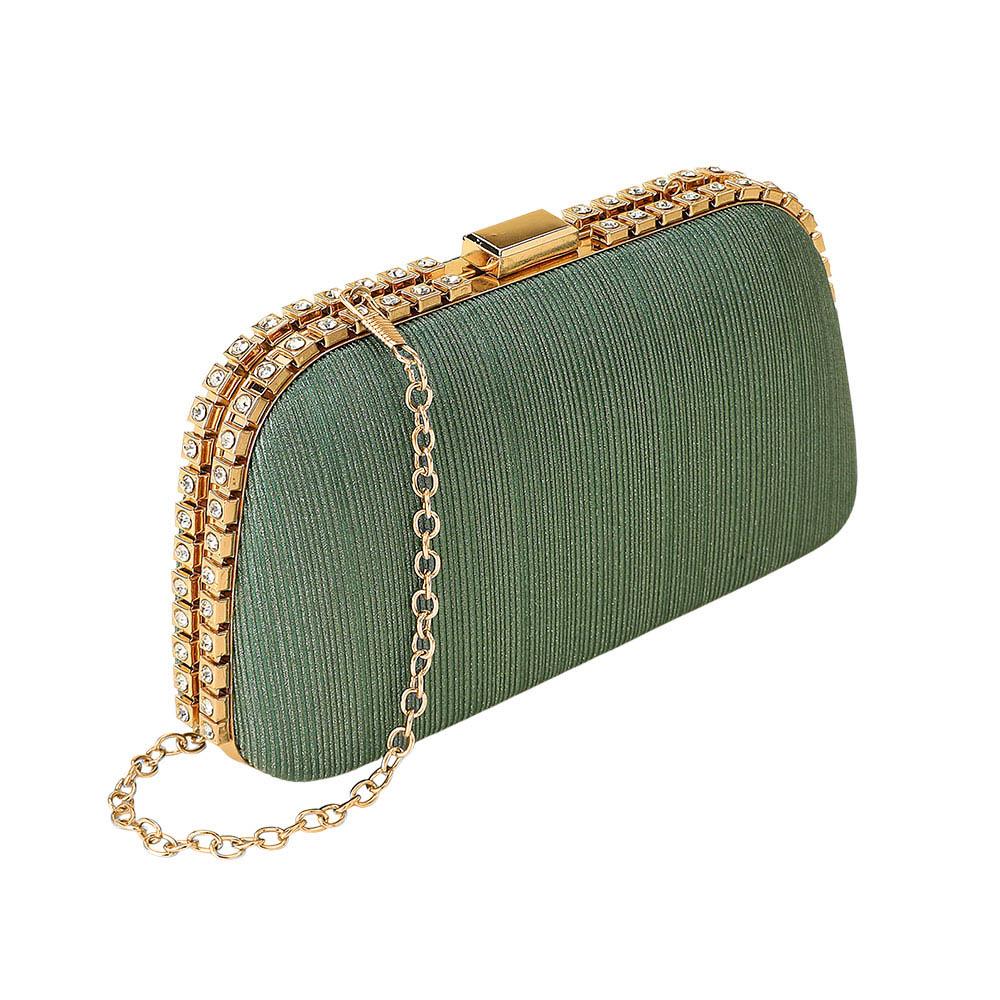 • Chic evening clutch featuring a textured finish, shimmering rhinestone trim, and a detachable chain strap. Designed with a sleek clasp closure and gold-tone accents, this sophisticated handbag is perfect for weddings, parties, and formal events, adding timeless glamour to any outfit.