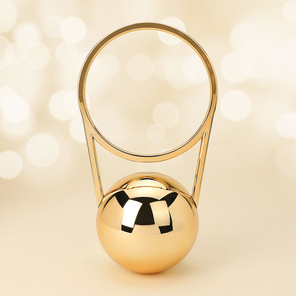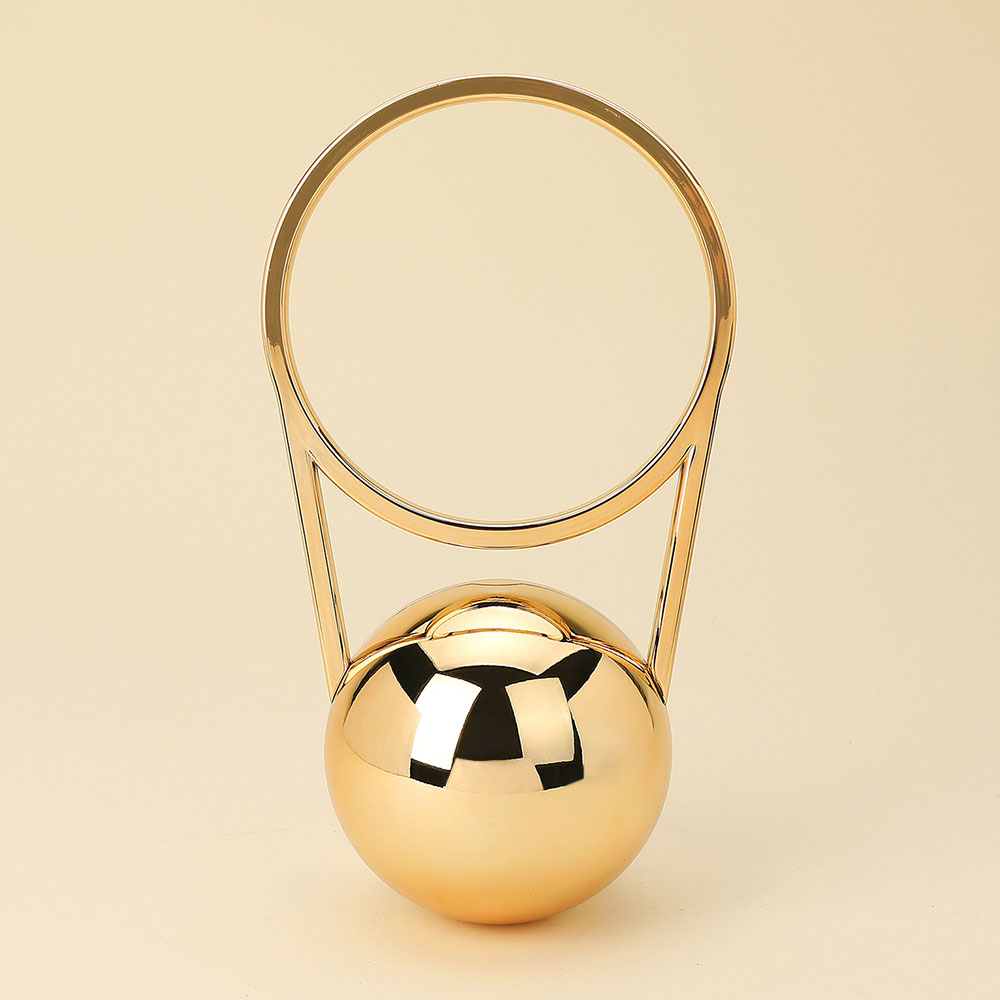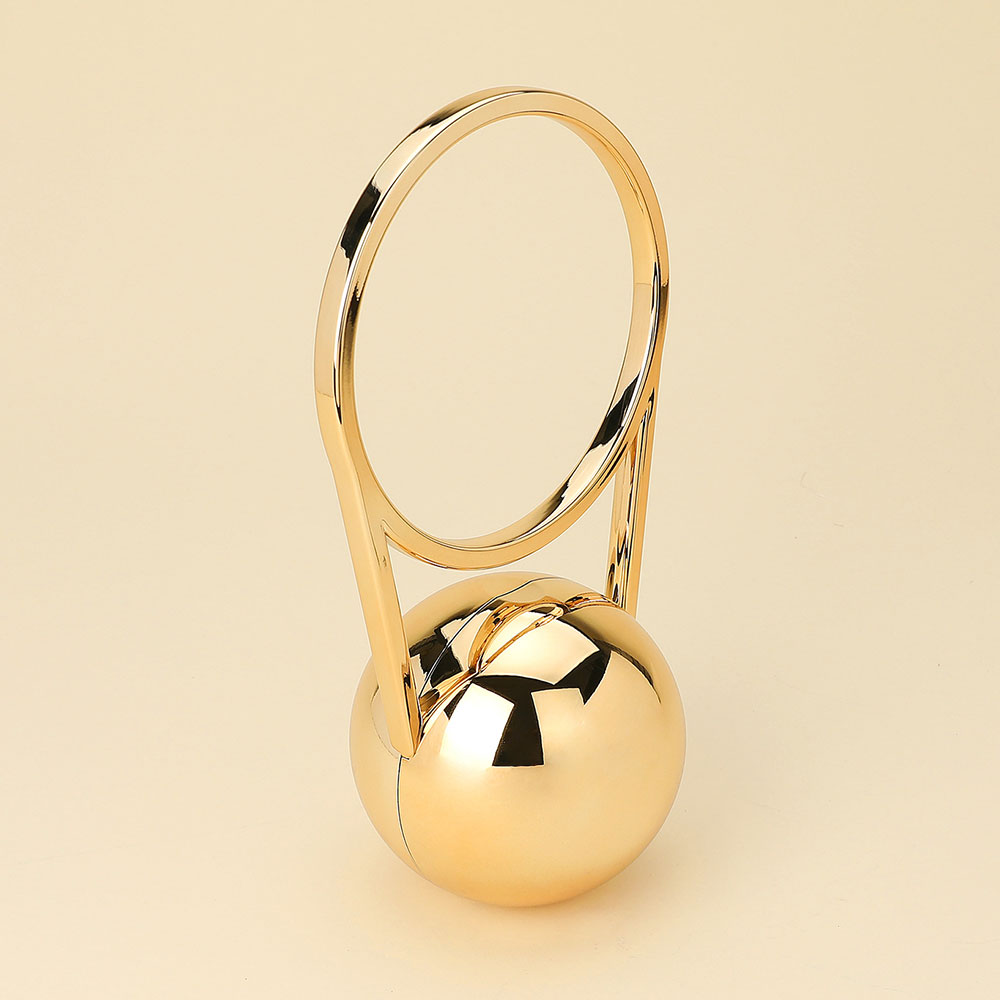 Details • Size : 5.5" X 10" X 4" • Magnetic Closure • This sculptural orb evening clutch showcases a sleek geometric design with a circular ring handle for a statement look. Its structured silhouette and polished finish bring a modern touch to formal and chic outfits, making it a standout accessory for special occasions.