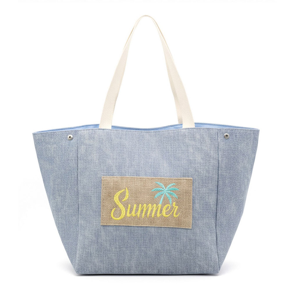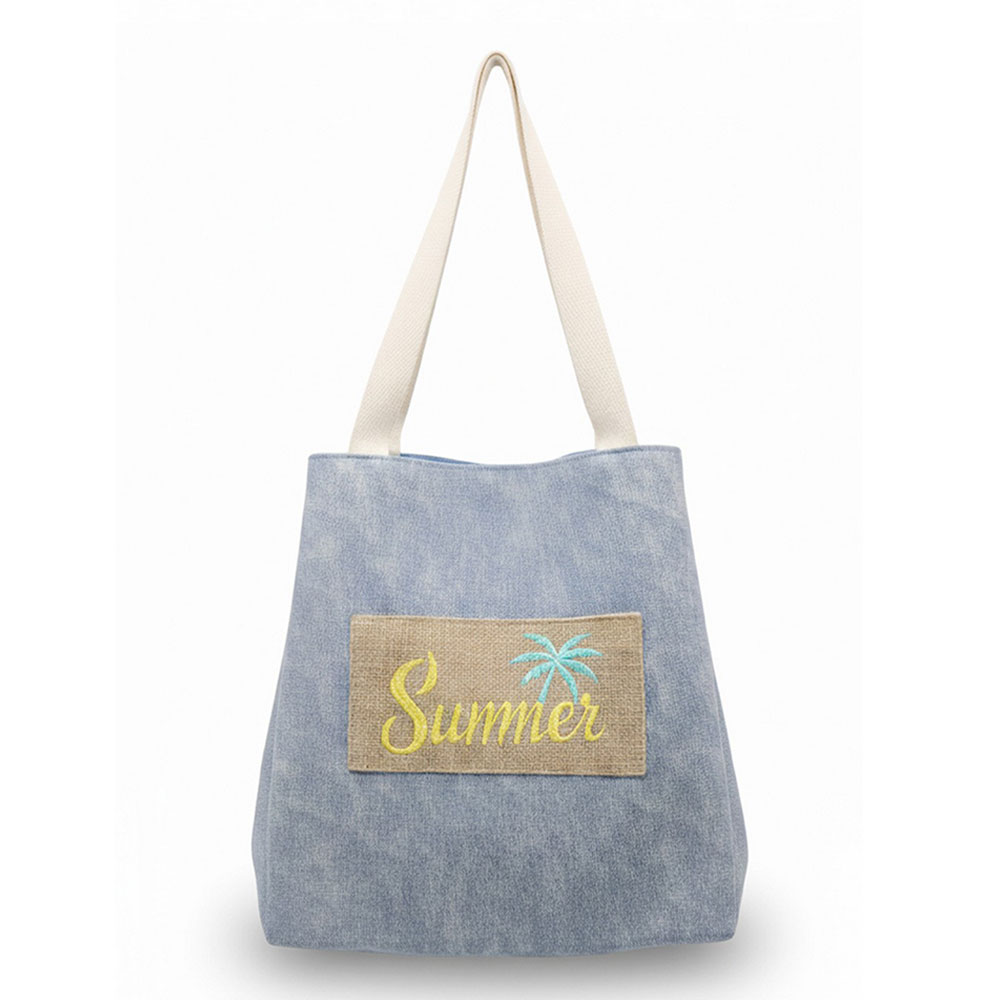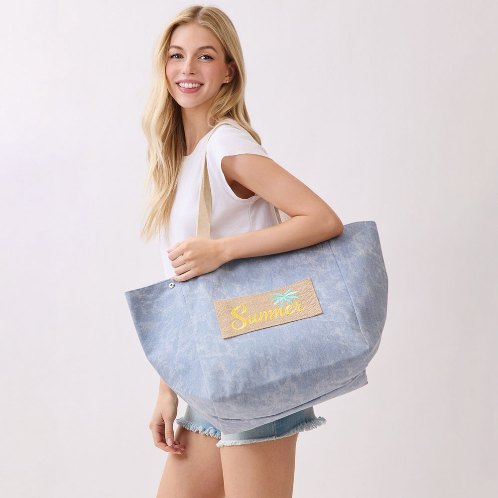 Details • Size : 22" X 13" X 9.5" • Inner Pocket • Magnetic Snap Closure • Material : 90% Polyester, 10% Burlap • Spacious everyday tote bag designed with a message patch for casual outings, travel, beach trips, and seasonal retail displays. Features a roomy interior and comfortable shoulder straps, making it ideal for carrying daily essentials, vacation must-haves, and warm-weather lifestyle accessories.