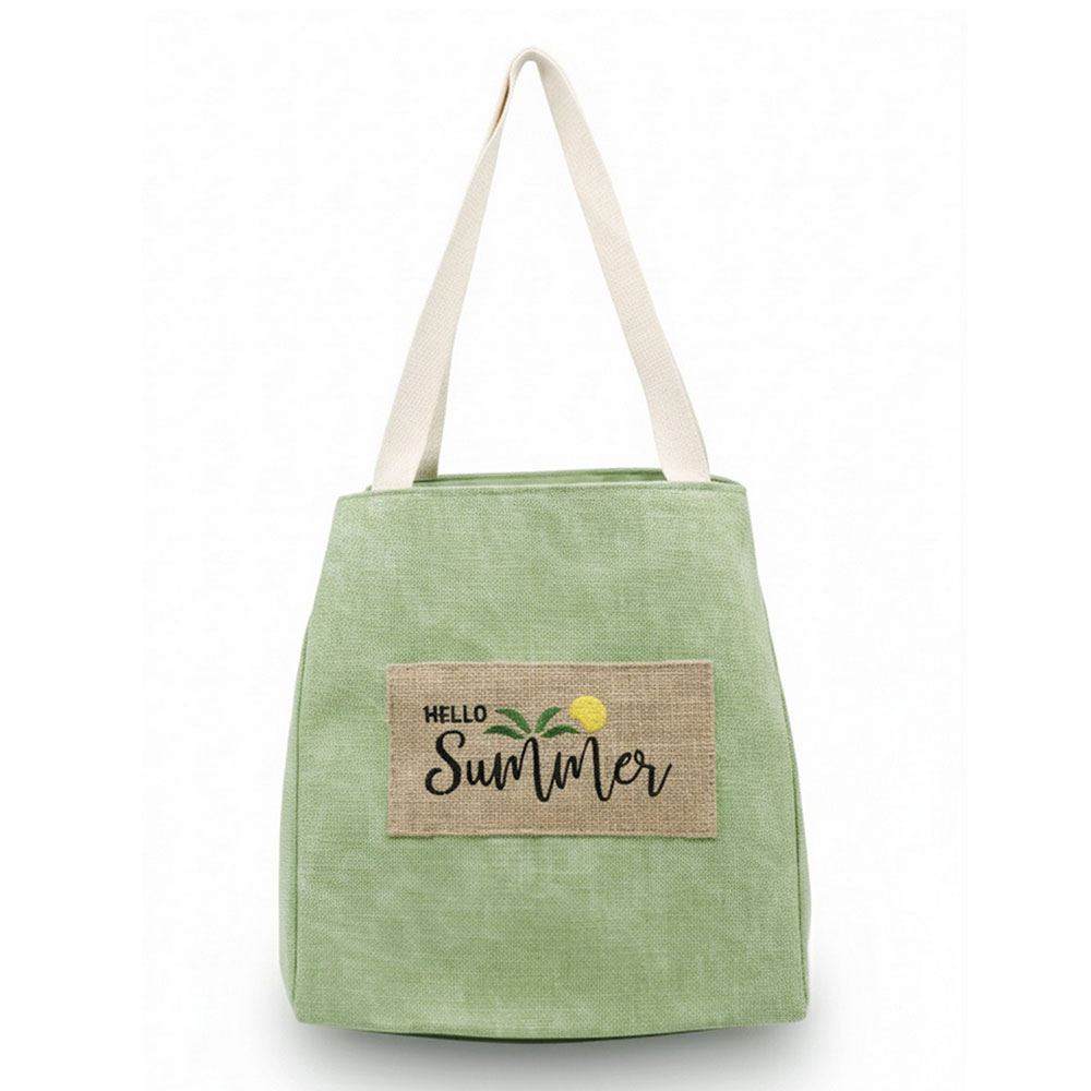 Details • Size : 22" X 13" X 9.5" • Inner Pocket • Magnetic Snap Closure • Material : 90% Polyester, 10% Burlap • Spacious everyday tote bag designed with a message patch for casual outings, travel, beach trips, and seasonal retail displays. Features a roomy interior and comfortable shoulder straps, making it ideal for carrying daily essentials, vacation must-haves, and warm-weather lifestyle accessories.