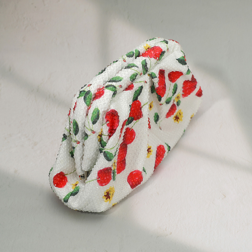 Details • Size : 8.5" X 5" X 2.5" • Strap Size : 47" L Detachable • Elegant floral clutch adorned with sparkling crystals and a sleek chain strap. Perfect for evening parties, weddings, and special occasions. A stylish accessory to carry essentials with charm.