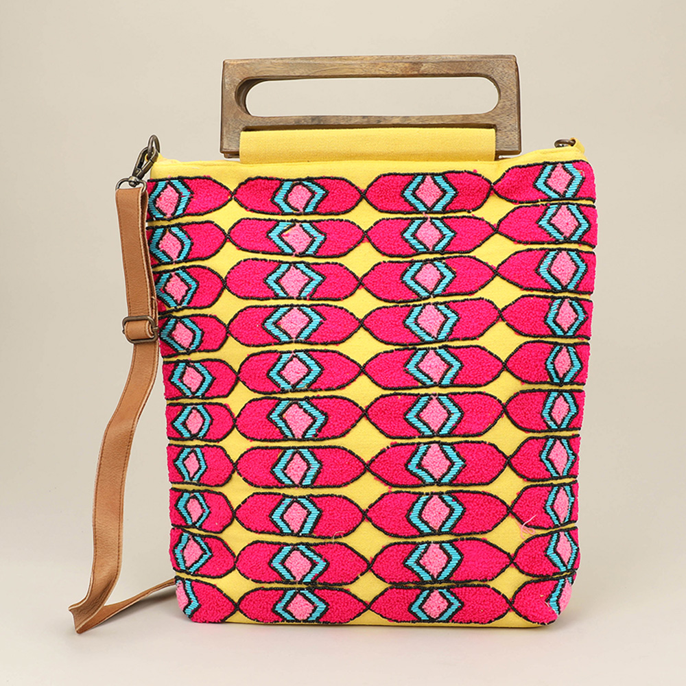 Boho Geometric Pattern Wooden Handle Tote / Crossbody Bag