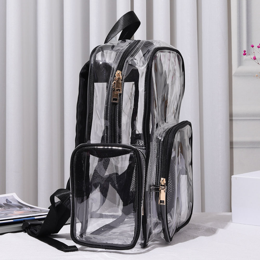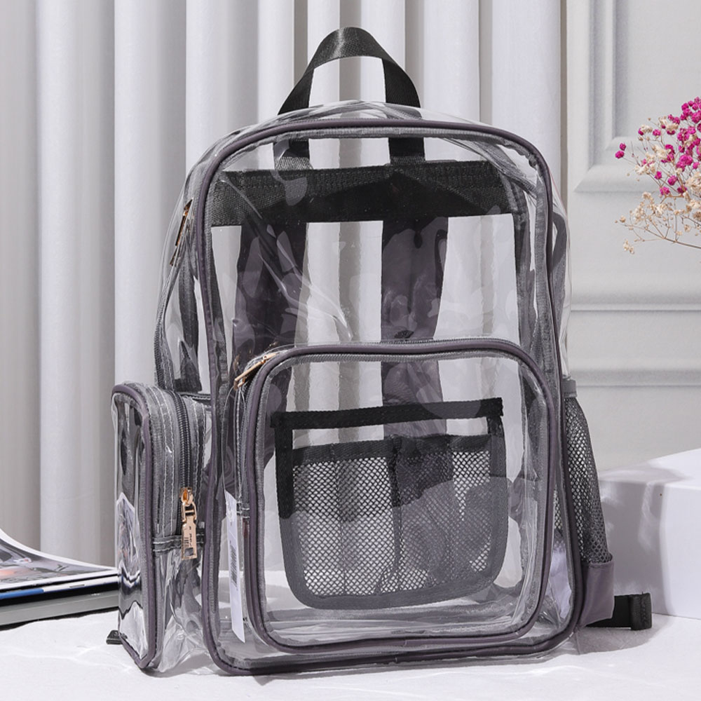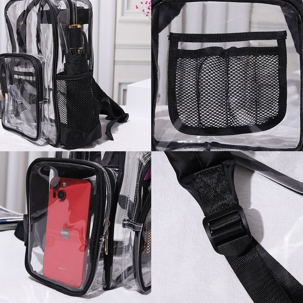 Details • Size : 14" X 14" X 4" • Strap Size : Adjustable • One Inside Divided Mesh Slip Pocket • One Zipper Pocket • One Side Zipper Pocket • One Side Mesh Slip Pocket • Zipper Closure • Durable transparent backpack featuring spacious compartments, mesh pockets, and zipper closures. Ideal for school, concerts, or travel where clear bags are required. Stylish and functional.