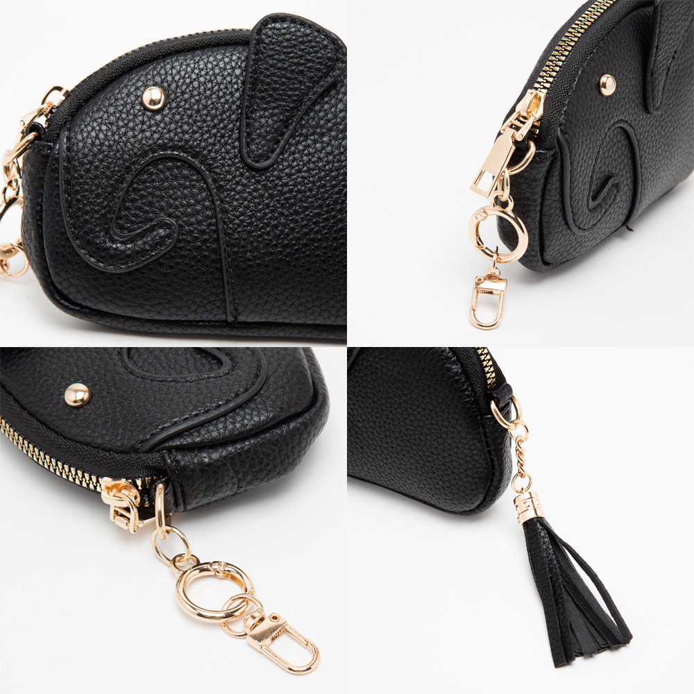 Details • Bag Size : 5.5" X 1.2" X 4" • Zipper Closure • This charming elephant-shaped coin purse offers a playful blend of style and function, featuring a secure zip closure, tassel accent, and compact design. Perfect for storing small essentials, it clips easily to bags or keys, adding a fun, whimsical touch to everyday organization.