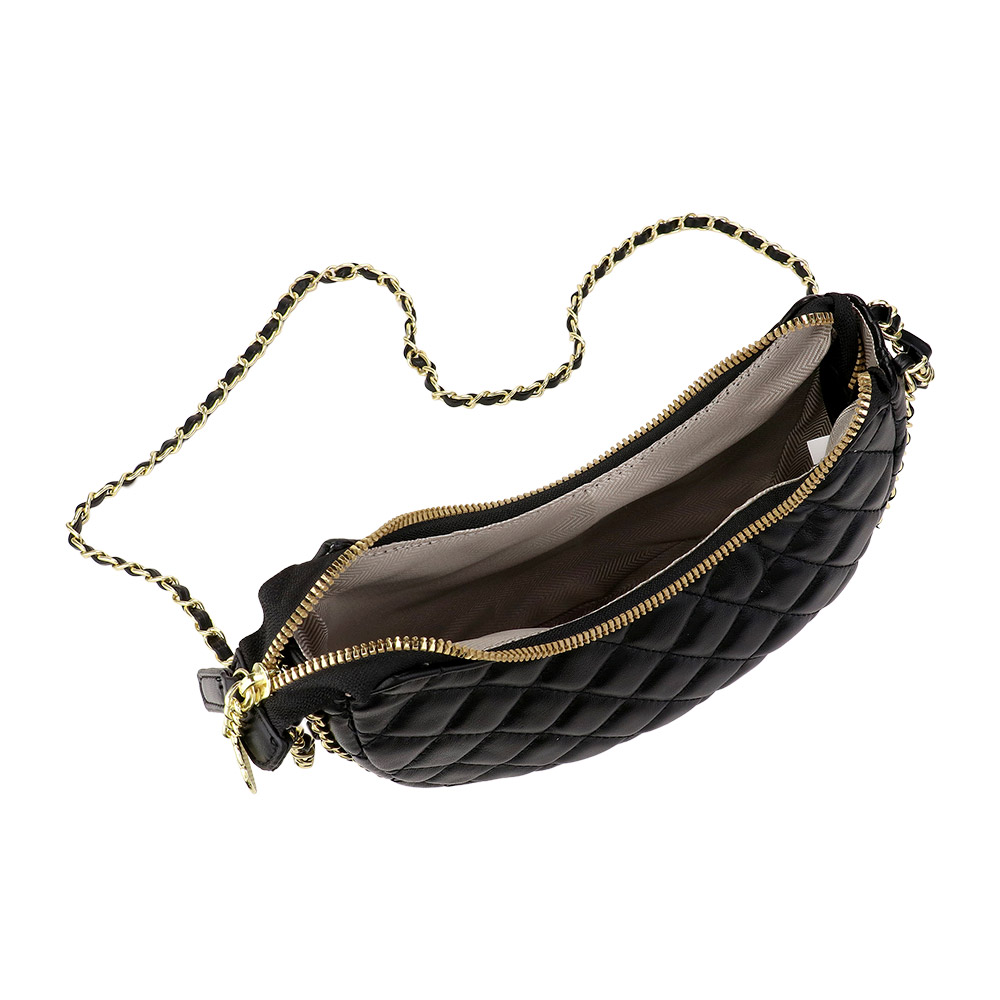 • Chic half-moon shoulder bag with woven texture and chain strap. A modern accessory for a sleek everyday look, combining elegance and practicality for day-to-night style.