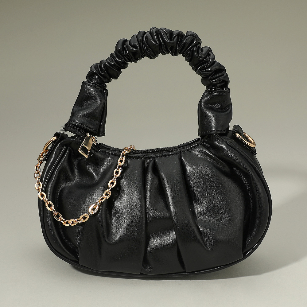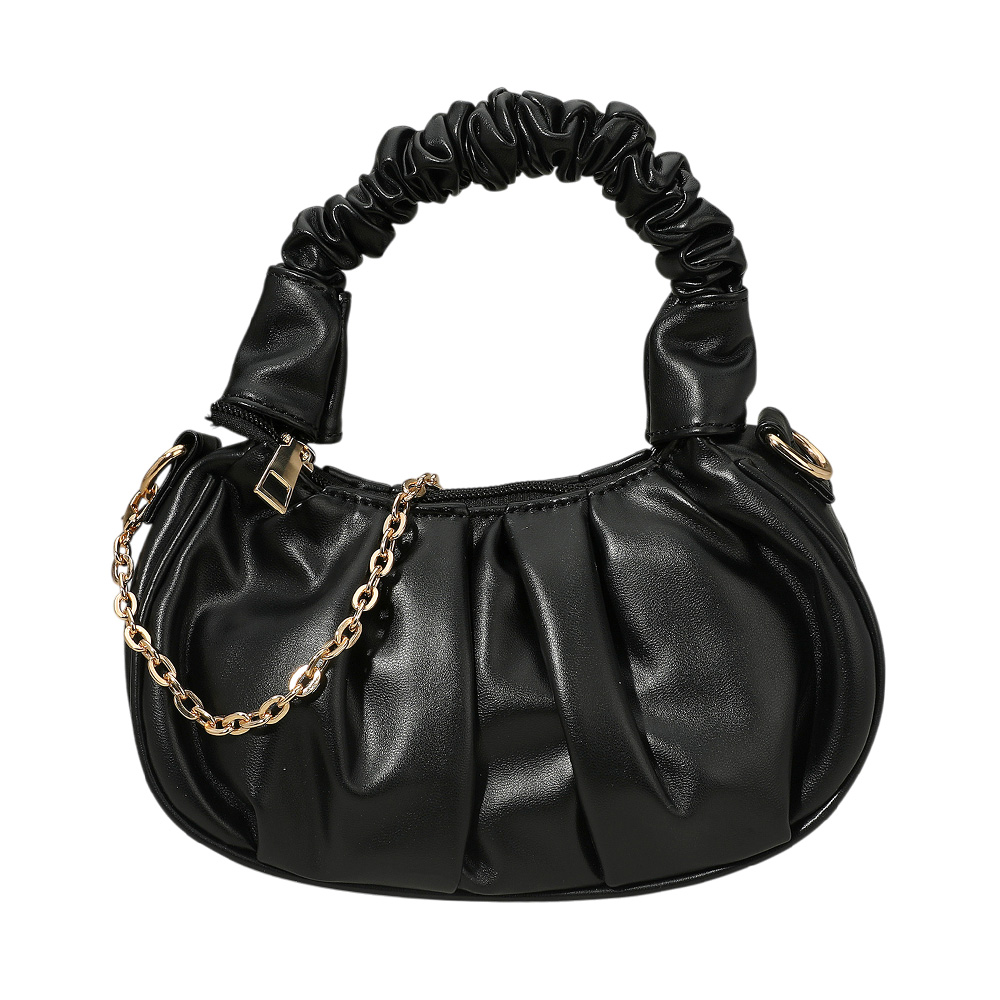 Details • Size : 8.25" X 4.75" X 2.75" • Top Handle Size : 3.25" L • Strap Size : 50" L / Detachable • Zipper Closure • Elevate any outfit with this chic black ruched handbag featuring a gathered handle and gold chain detail. Its modern silhouette and versatile design make it perfect for day-to-night wear, adding effortless style and sophistication to your look.