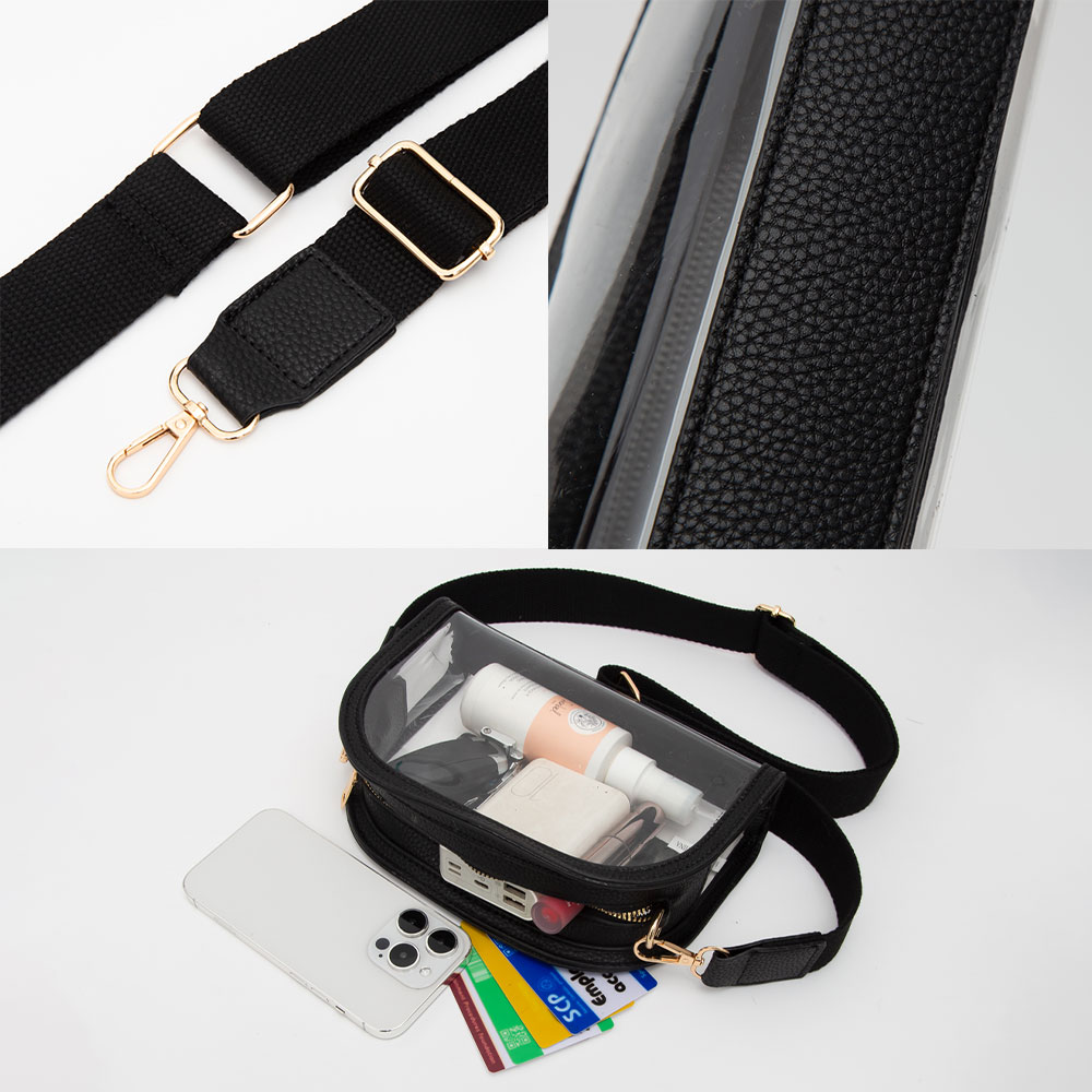 • This clear adjustable crossbody bag offers practical style and modern appeal, perfect for stadiums, concerts, and daily use. Designed with a transparent body, wide strap, and secure zip closure, it keeps essentials visible and organized while ensuring hands-free convenience and comfort.