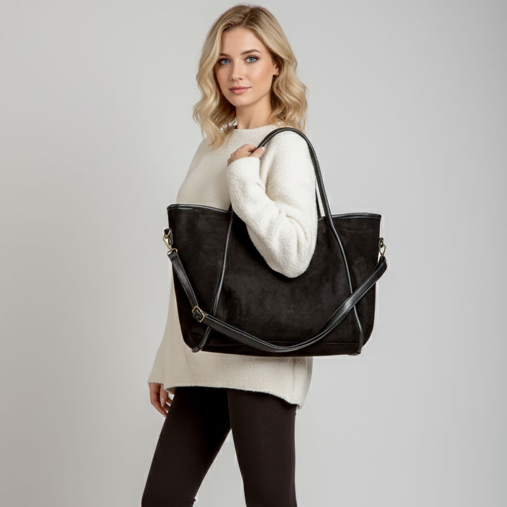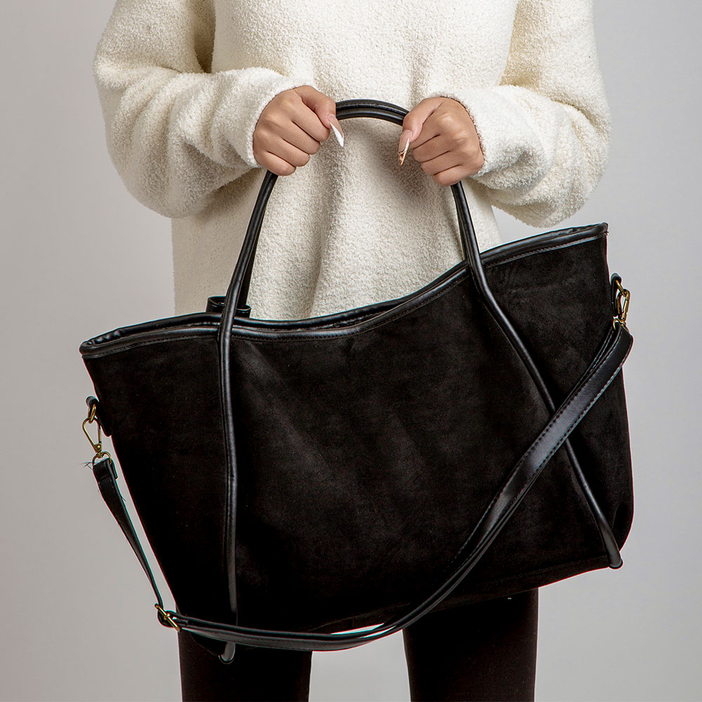 • This suede-style tote bag blends elegance with practicality, featuring dual handles for easy carrying and a roomy interior to keep essentials organized. A versatile design that transitions seamlessly from work to casual outings while adding a touch of sophistication.