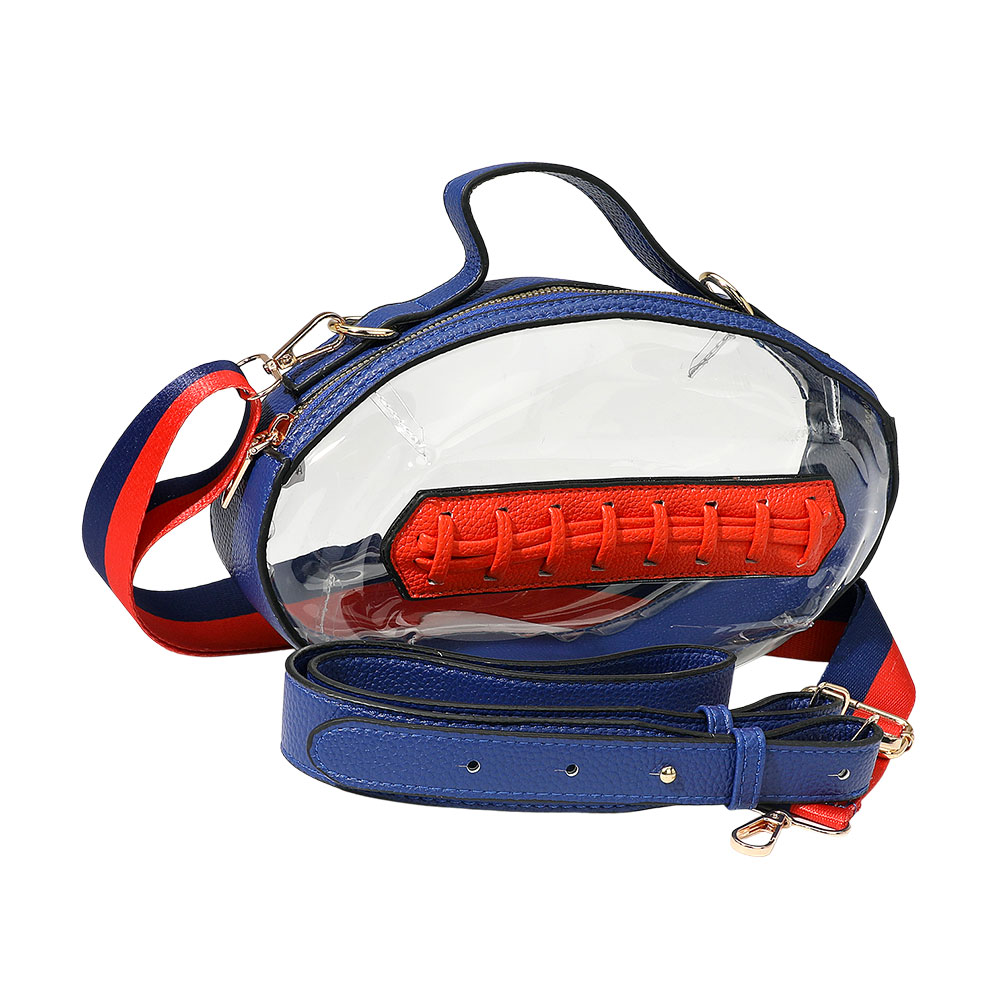 Details • Size : 10.75" X 5" X 5" X 2.6" • Top Handle Size : 2.25" L • Strap 1 Size : 36" L / Detachable, Adjustable • Strap 2 Size : 49" L / Detachable, Adjustable • Oval clear crossbody bag with wide adjustable strap, zip closure, and bold front accent detail. Lightweight and stadium-approved, this stylish accessory blends fashion and function for everyday or event use.