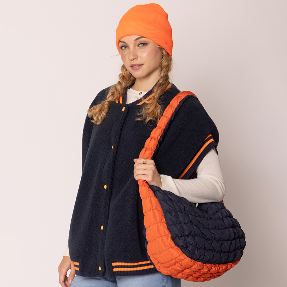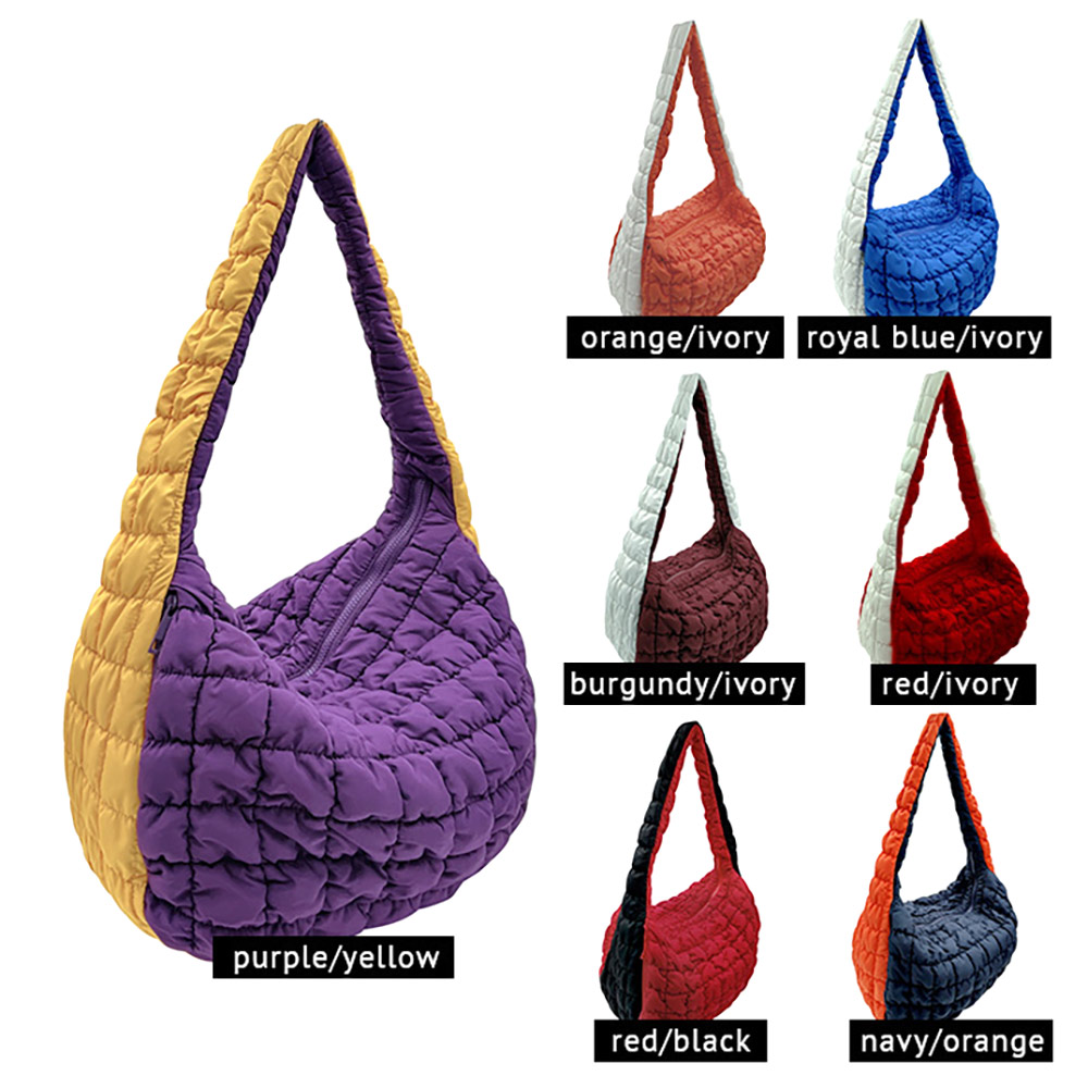• Show team spirit with this gameday quilted shoulder tote bag, designed with bold contrasting colors and a roomy interior. Lightweight and comfortable, perfect for sporting events, tailgates, or casual outings in style.