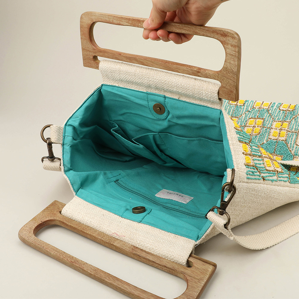 Handcrafted Beaded Boho Wood Handle Tote / Crossbody Bag