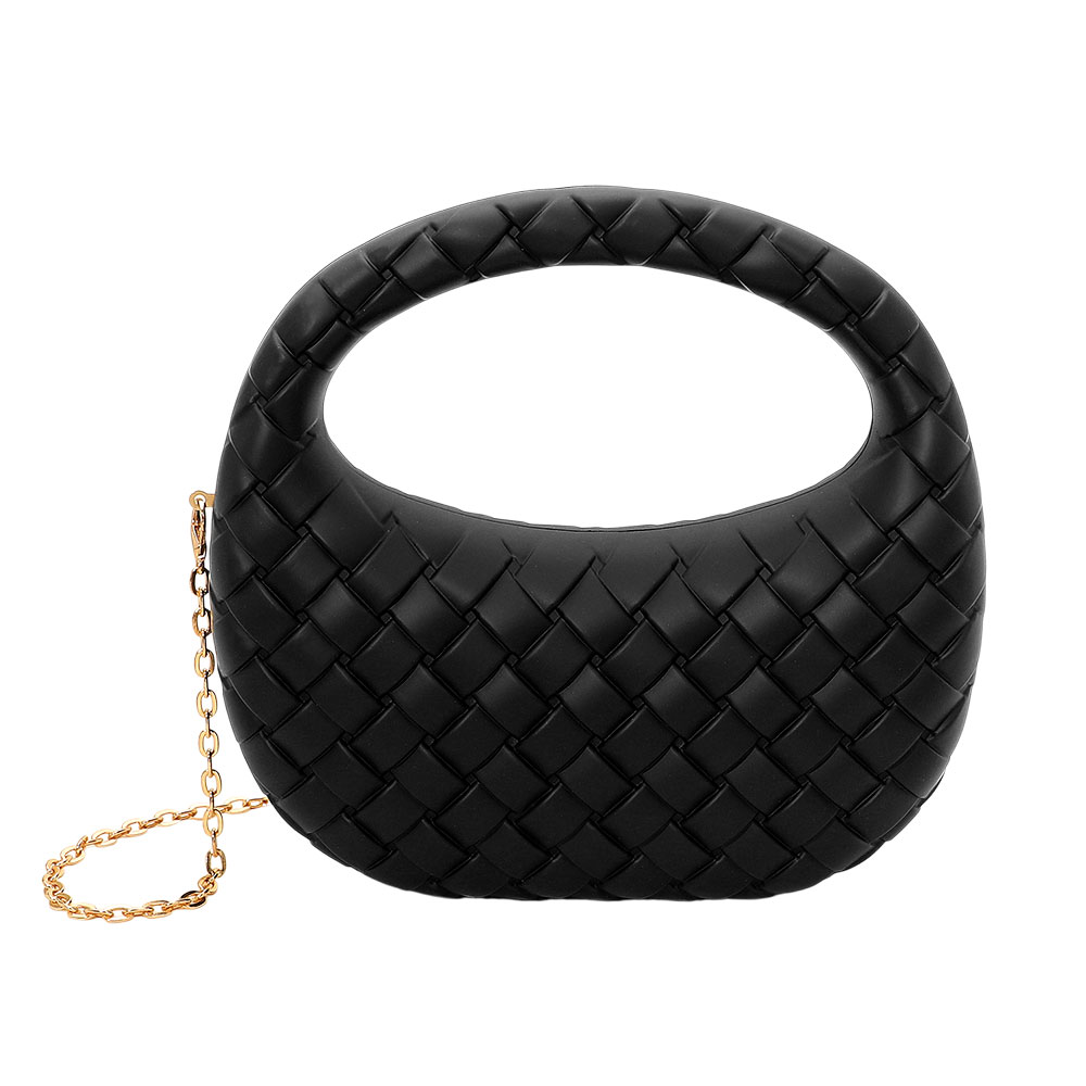 Details • Size : 8.5" X 4" X 2.75" • Top Handle Size : 3.75" L • Strap Size : 46" L / Detachable • Magnetic Closure • A stylish woven-pattern evening clutch designed with a sculpted handle and a sleek silhouette. The compact shape offers modern sophistication, while the detachable chain strap adds versatile wear for special events, nights out, and elegant occasions.