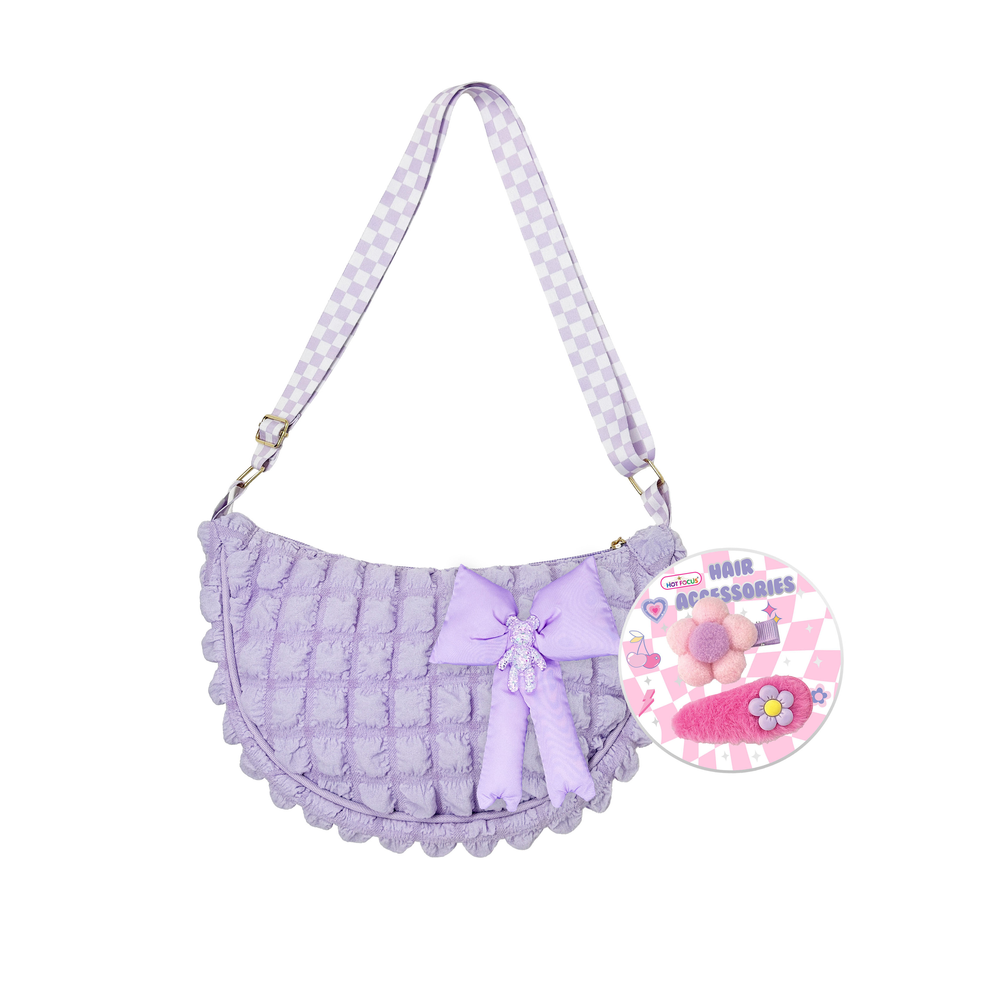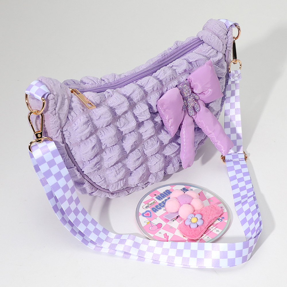 • Textured shoulder bag with oversized bow detail and matching adjustable strap. Comes with a coordinating hair accessories set including clips and ties. Perfect for gifting, parties, or everyday dress-up fun.