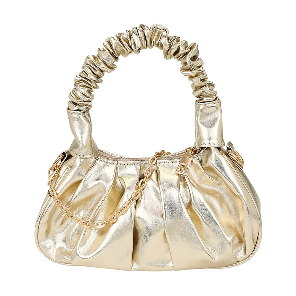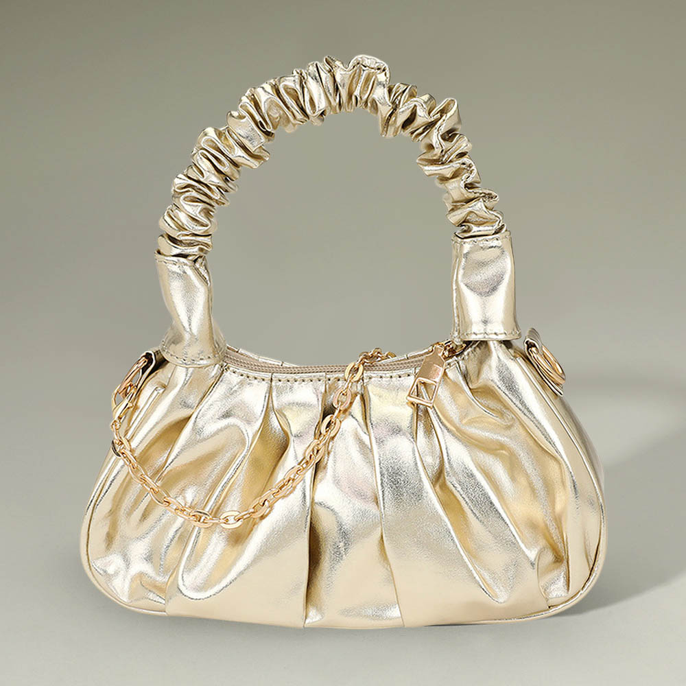 • Elevate any outfit with this chic ruched handbag featuring a gathered handle and gold chain detail. Its modern silhouette and versatile design make it perfect for day-to-night wear, adding effortless style and sophistication to your look.