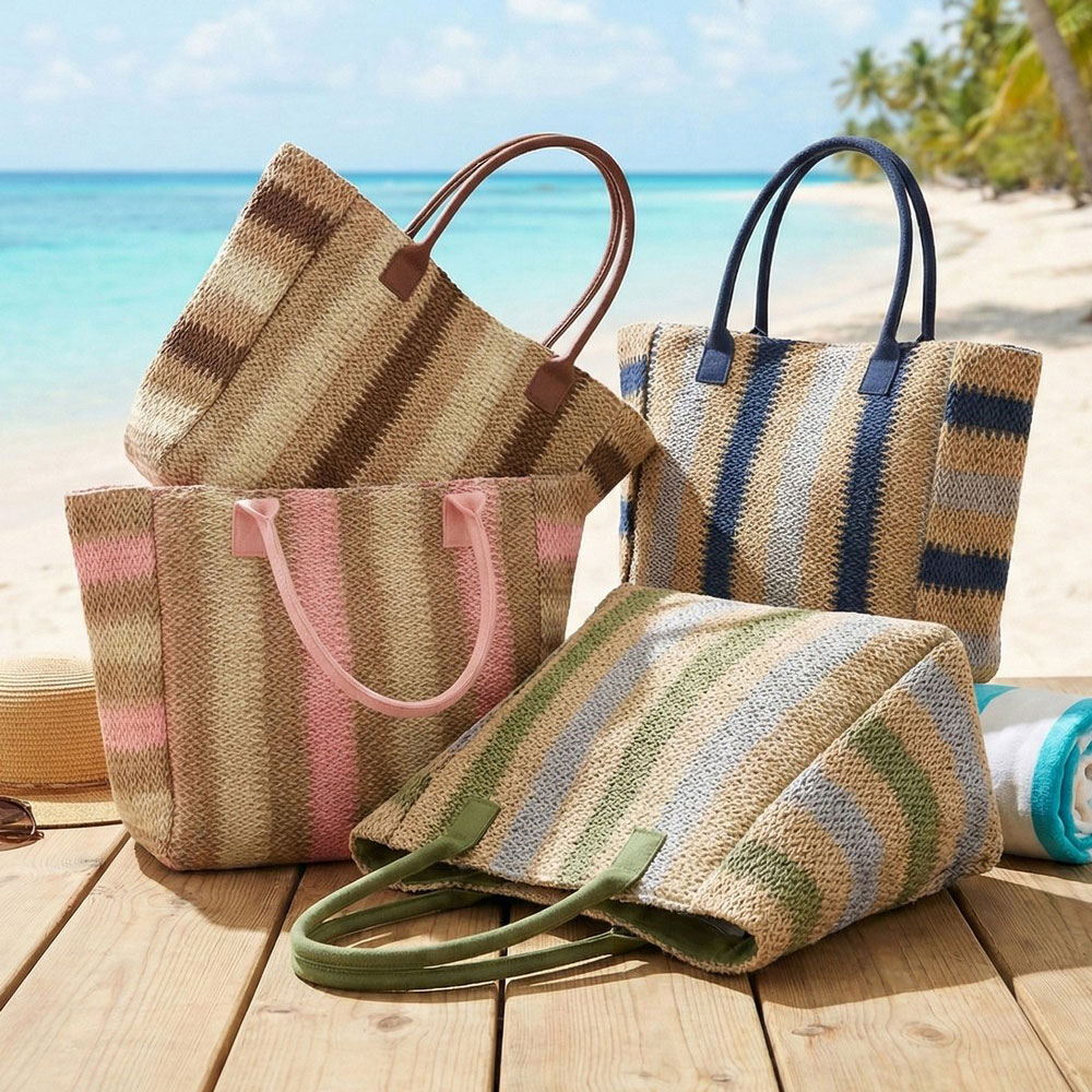 • Spacious striped tote bag designed for everyday use, travel, shopping, and weekend outings. Features a roomy open interior to carry essentials, clothing, or accessories with ease. Comfortable shoulder handles offer effortless wear, making it a versatile choice for boutiques, resort shops, and seasonal collections.