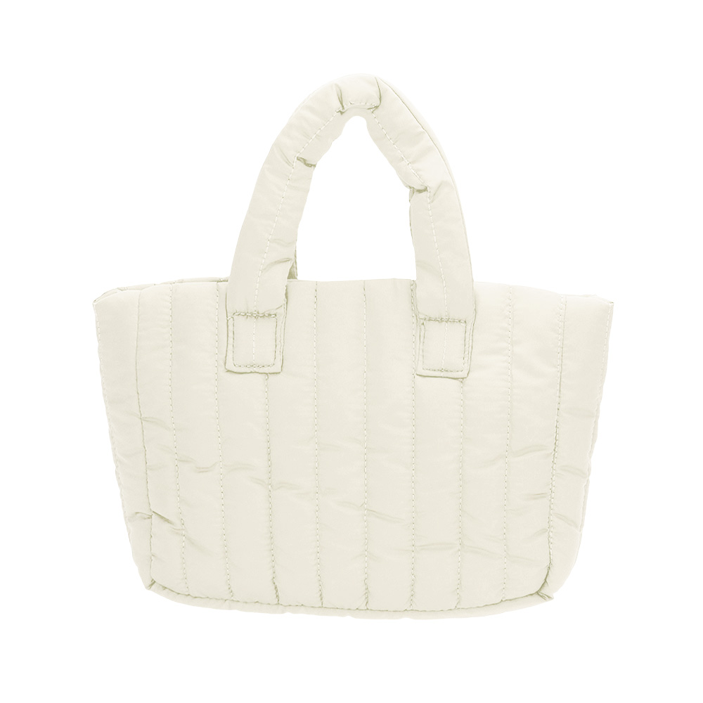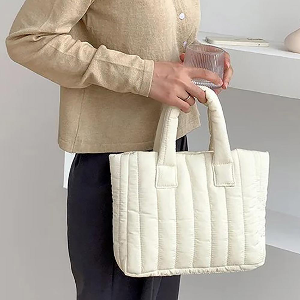 Details • Size : 12" X 8" X 3" • Top Handle Size : 4" L • Magnetic Closure • One Inside Zipper Pocket • Two Inside Slip Pockets • This quilted tote bag offers a stylish blend of simplicity and comfort with its soft handles and structured design. Perfect for daily use, it provides ample space for essentials while maintaining a chic, modern look suited for work, errands, or casual outings.