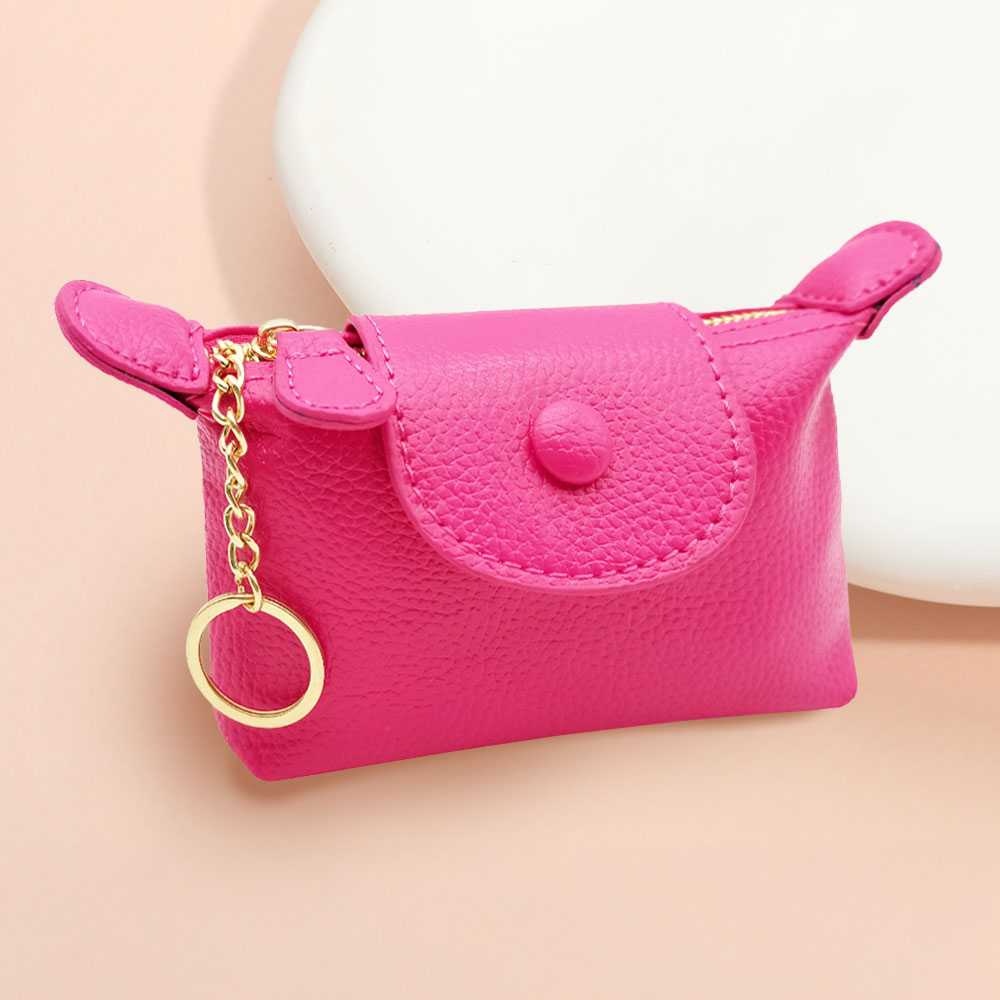 Details • Size : 5" X 3" X 0.75" • Material : 100% Polyurethane • Snap Button Closure • Zipper Closure • Stay organized on the go with this compact wallet pouch featuring dual compartments—zipper and snap—for coins, cards, cash, and small essentials. With a keyring and chic design, it clips to bags or keys for everyday convenience and style in one versatile accessory.