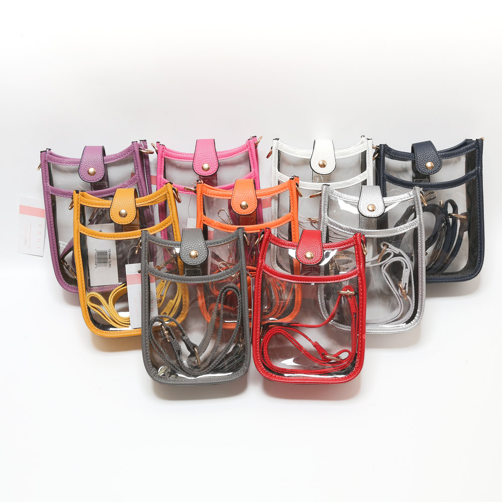• Compact transparent crossbody bag with faux leather trim and adjustable wide strap. Stadium-approved design ideal for concerts, festivals, and sporting events. Secure snap closure and stylish silhouette.