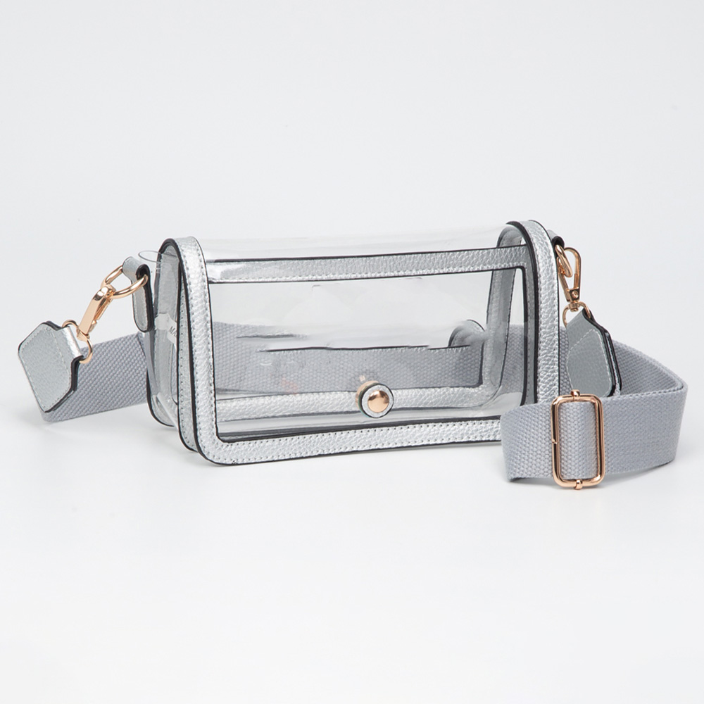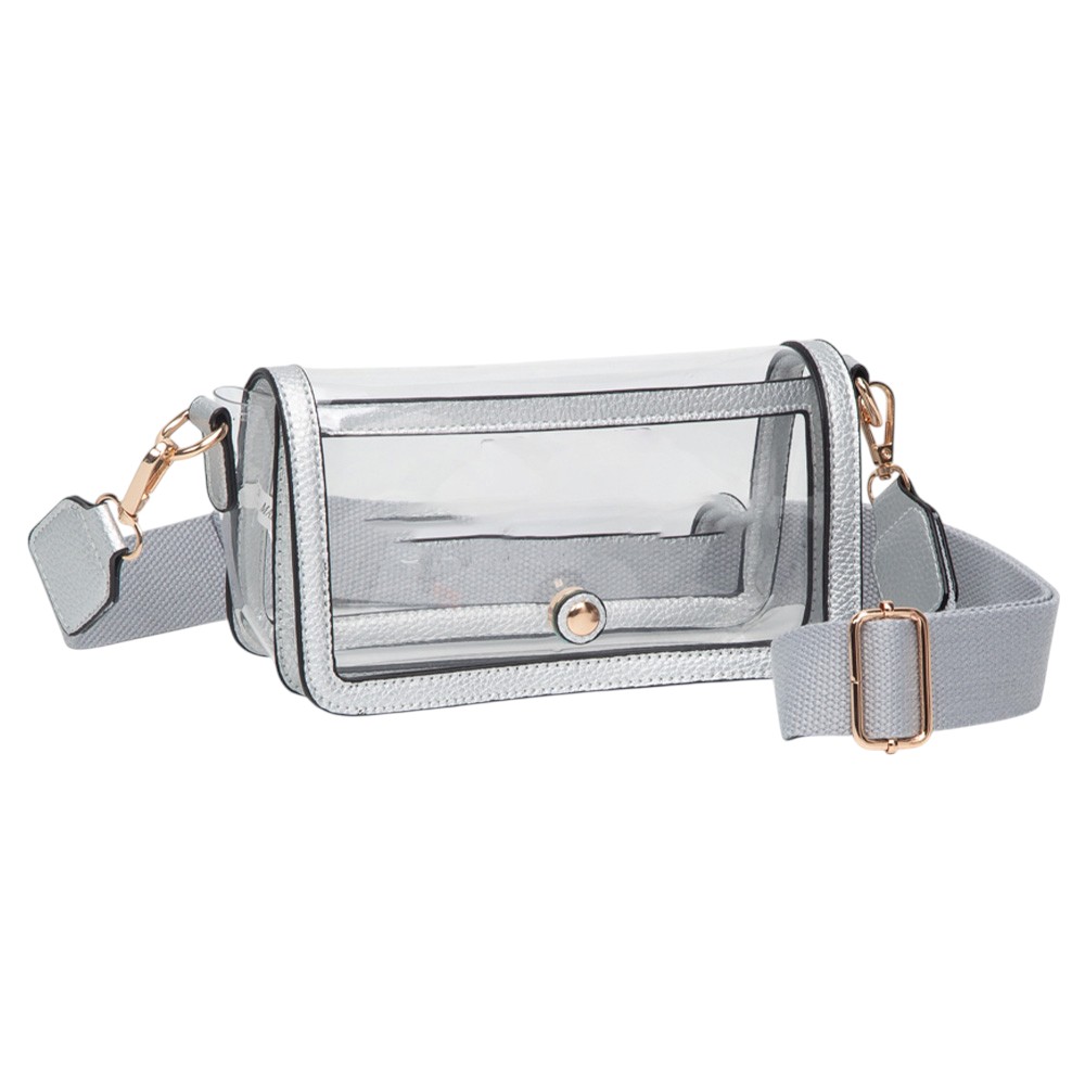 • Stay stylish and compliant with this clear stadium-approved crossbody bag, featuring black trim, secure snap closure, and an adjustable shoulder strap for comfort. Perfect for concerts, sporting events, festivals, and everyday use, offering convenience while meeting event regulations with ease.